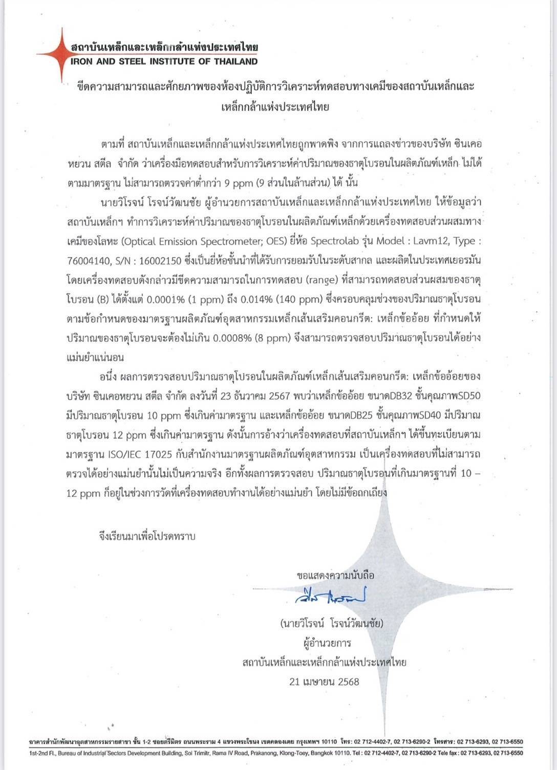 อนึ่ง ผลการตรวจสอบปริมาณธาตุโปรอนในผลิตภัณฑ์เหล็กเส้นเสริมคอนกรีต: เหล็กข้ออ้อยของ บริษัท ซินเคอหยวน สตีล จำกัด ลงวันที่ 23 ธันวาคม 2567 พบว่าเหล็กข้ออ้อย ขนาด DB32 ชั้นคุณภาพSD5D50 มีปริมาณธาตุโบรอน 10 ppm ซึ่งเกินค่ามาตรฐาน และเหล็กข้ออ้อย ขนาด DB25 ชั้นคุณภาพ SD40 มีปริปริมาณ ธาตุโบรอน 12 ppm ซึ่งเกินค่ามาตรฐาน