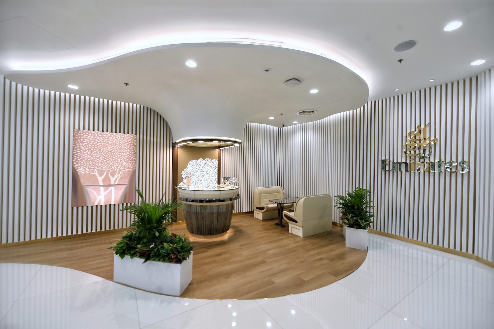 ขณะเดียวกันสำนักงานได้ออกแบบในรูปแบบห้องรับรองที่เปิดโล่ง ครอบคลุมพื้นที่กว่า 250 ตารางเมตร และสะท้อนถึงการออกแบบที่โปร่งสบายของห้องโดยสารภายในเครื่องบินของสายการบินเอมิเรตส์ ภายในร้านมีเคาท์เตอร์ให้บริการผู้โดยสาร