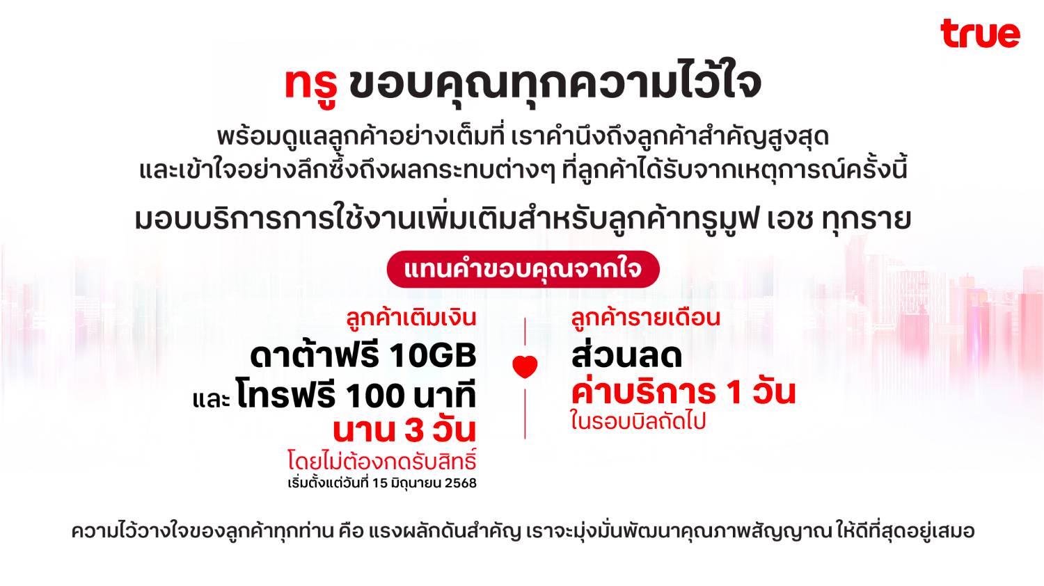 ทรู ขอขอบคุณทุกความไว้ใจ พร้อมดูแลลูกค้าอย่างเต็มที่ มอบดาต้า 10 GB และโทรฟรี 100 นาที นาน 3 วันสำหรับลูกค้าเติมเงิน และส่วนลดค่าบริการ 1 วันสำหรับลูกค้ารายเดือน