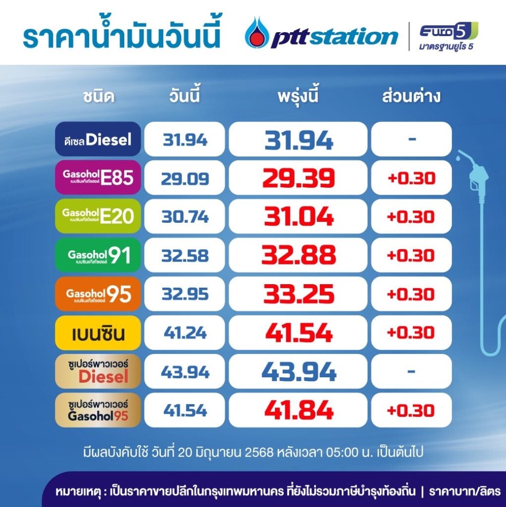 บริษัท ปตท.น้ำมันและการค้าปลีก จำกัด(มหาชน) และ บมจ.บางจาก ได้มีการประกาศปรับราคาขายปลีกน้ำมันเบนซินและกลุ่มแก๊สโซฮอล์ทุกชนิดขึ้น 30 สตางค์/ลิตร ส่วนกลุ่มดีเซลทุกชนิด ราคาคงเดิม มีผลตั้งแต่วันที่ 20 มิ.ย. 2568 เวลา 05.00 น.