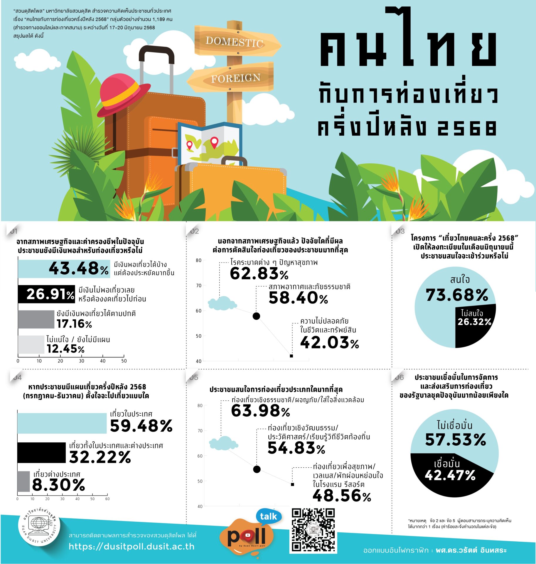 22 มิ.ย. 2568 – “สวนดุสิตโพล” มหาวิทยาลัยสวนดุสิต สำรวจความคิดเห็นประชาชนทั่วประเทศ เรื่อง “คนไทยกับการท่องเที่ยวครึ่งปีหลัง 2568” กลุ่มตัวอย่าง จำนวน 1,189 คน (สำรวจทางออนไลน์และภาคสนาม) ระหว่างวันที่ 17-20 มิถุนายน 2568 พบว่า จากเศรษฐกิจและค่าครองชีพปัจจุบันยังพอมีเงินพอเที่ยวได้บ้าง แต่ต้องประหยัดมากขึ้น ร้อยละ 43.48 นอกจากปัจจัยด้านเศรษฐกิจแล้ว โรคระบาดและปัญหาสุขภาพก็เป็นปัจจัยที่ส่งผลต่อการตัดสินใจท่องเที่ยว ร้อยละ 62.83 และกลุ่มตัวอย่างร้อยละ 73.68 สนใจโครงการเที่ยวคนละครึ่งที่เปิดให้ลงทะเบียน สำหรับการท่องเที่ยวในครึ่งปีหลังจะเที่ยวในประเทศ ร้อยละ 59.48 โดยสนใจการท่องเที่ยวเชิงธรรมชาติ ผจญภัย ใส่ใจสิ่งแวดล้อม ร้อยละ 63.98 ทั้งนี้รู้สึกไม่เชื่อมั่นต่อการจัดการและส่งเสริมการท่องเที่ยวของรัฐบาลชุดปัจจุบัน ร้อยละ 57.53