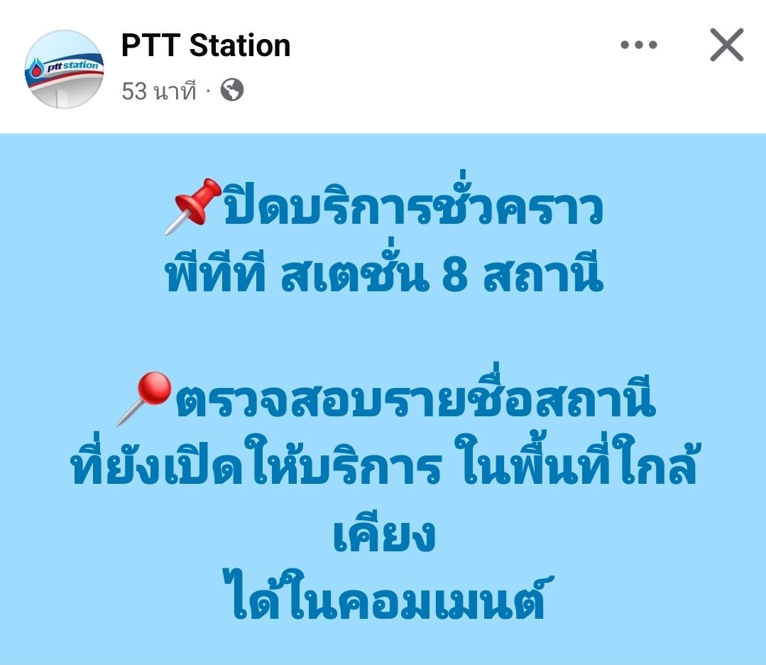 ทั้งนี้ สามารถตรวจสอบสถานีที่ยังเปิดให้บริการในพื้นที่ใกล้เคียงได้ที่เพจเฟซบุ๊ค PTT station : https://www.facebook.com/share/1CE27CrZrq/