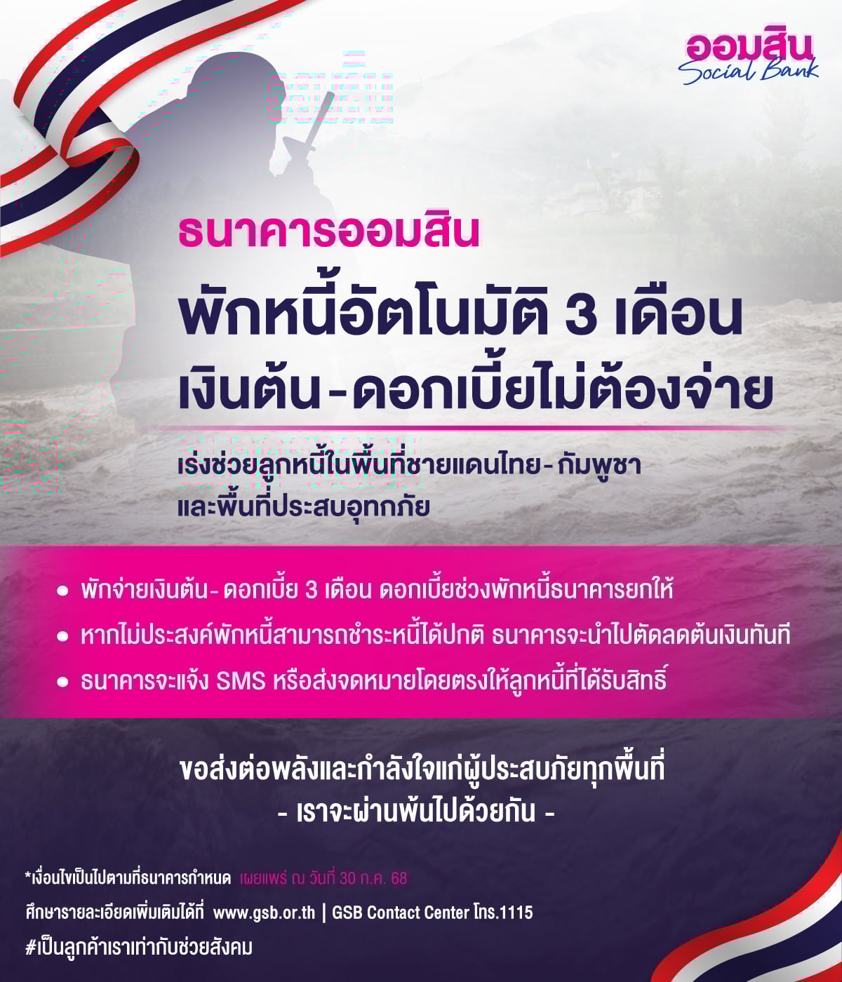 ‘ออมสิน’ ลุยออกมาตรการพักหนี้อัตโนมัติ นาน 3 เดือน พร้อมยกดอกเบี้ยให้ไม่ต้องจ่าย ปูพรมช่วยลูกค้าที่ได้รับผลกระทบจากเหตุความไม่สงบในพื้นที่ชายแดนไทย-กัมพูชา และพื้นที่น้ำท่วมภาคเหนือ 40,000 บัญชี คิดเป็นเงินต้นกวา 9,000 ล้านบาท