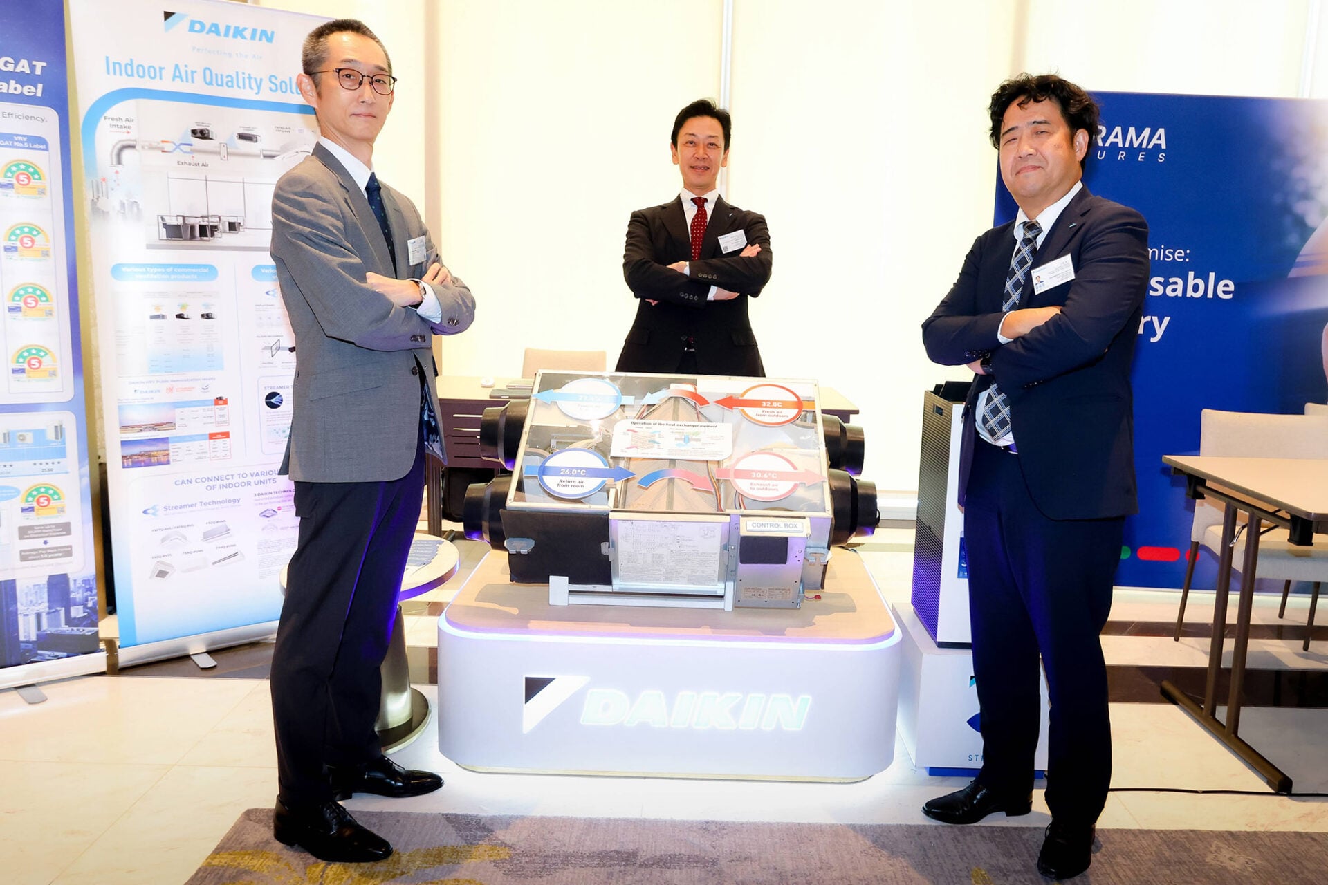 ทั้งนี้ เพื่อลดปัญหาดังกล่าว ไดกิ้นจึงพัฒนา Energy-Saving Ventilation System ที่สามารถลดความชื้นของอากาศก่อนนำเข้าสู่อาคาร พร้อมระบบแลกเปลี่ยนความร้อนกับอากาศภายใน ช่วยให้สามารถตั้งอุณหภูมิสูงขึ้นที่ 26–27°C ได้โดยยังรู้สึกเย็นสบาย และลดการใช้พลังงานไฟฟ้าได้มากกว่า 35% เมื่อเทียบกับระบบเดิม และหากใช้งานร่วมกับแอร์ระบบอินเวอร์เตอร์และระบบ Heat Recovery จะสามารถลดการใช้ไฟฟ้าลงได้สูงสุดถึง 60%