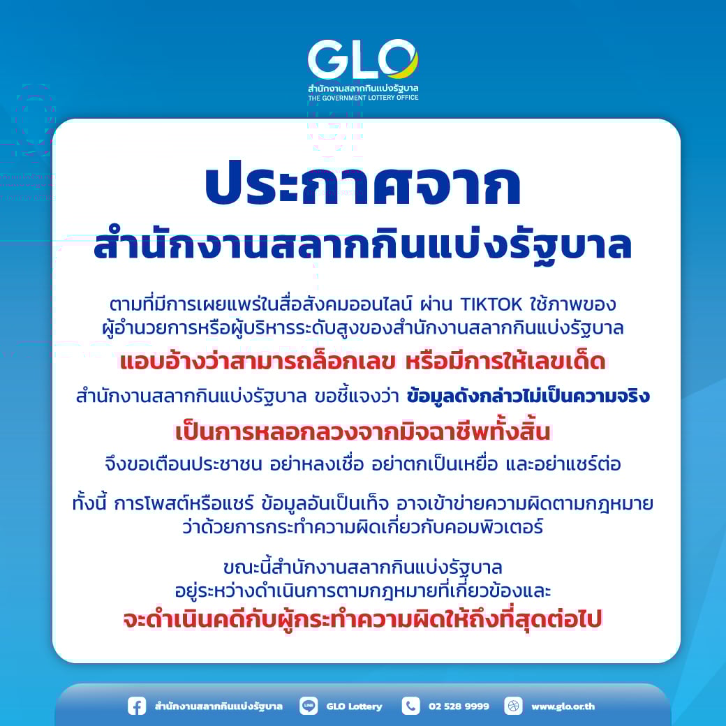 ตามที่มีการเผยแพร่ในสื่อสังคมออนไลน์ โดยเฉพาะแพลตฟอร์ม TikTok โดยแอบอ้างใช้ภาพของผู้อำนวยการ หรือผู้บริหารระดับสูงของสำนักงานสลากกินแบ่งรัฐบาล ปลอมแปลงภาพ เสียง หรือเนื้อหา ว่าสามารถล็อกเลข ให้เลขหลุด หรือมีการให้เลขเด็ด