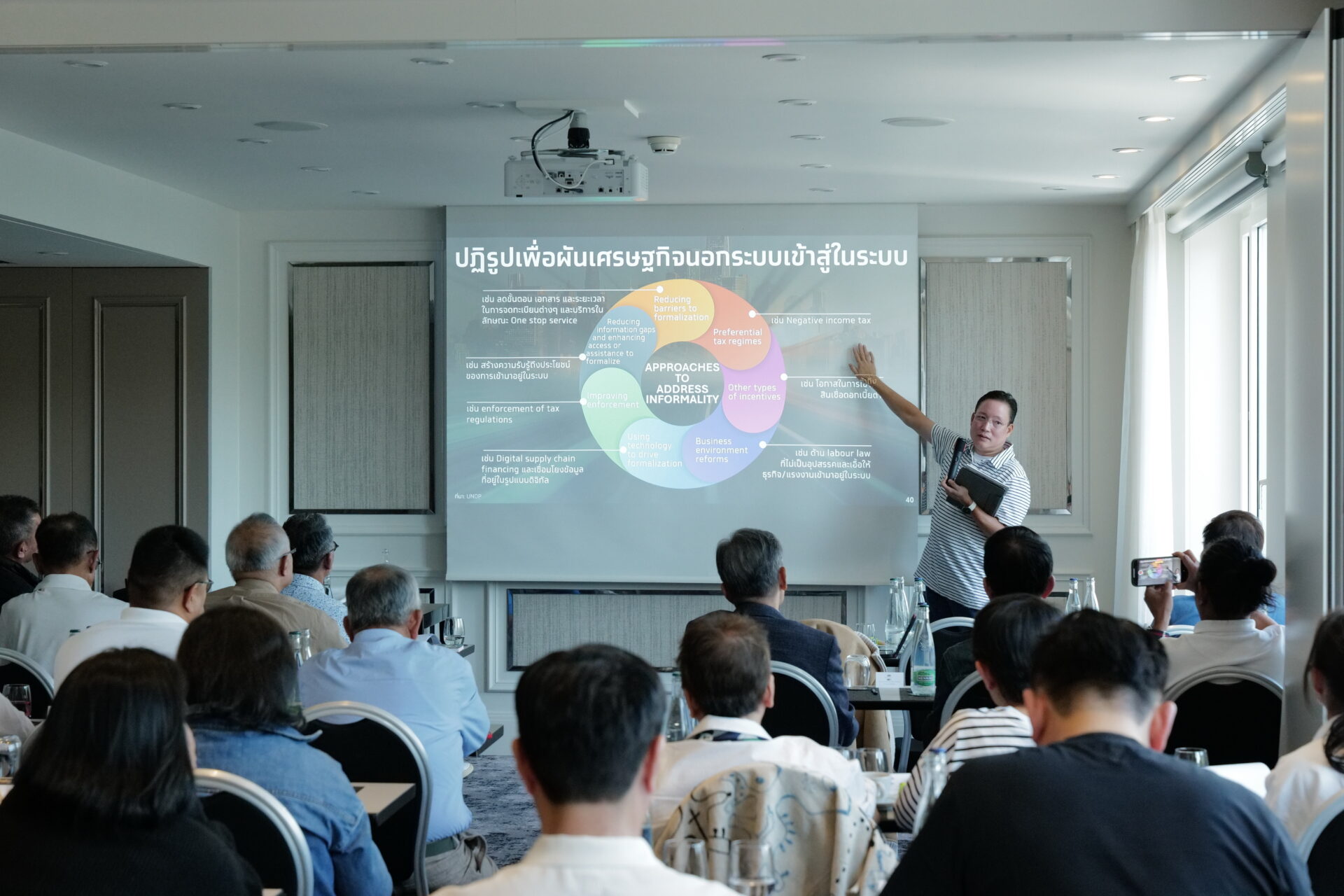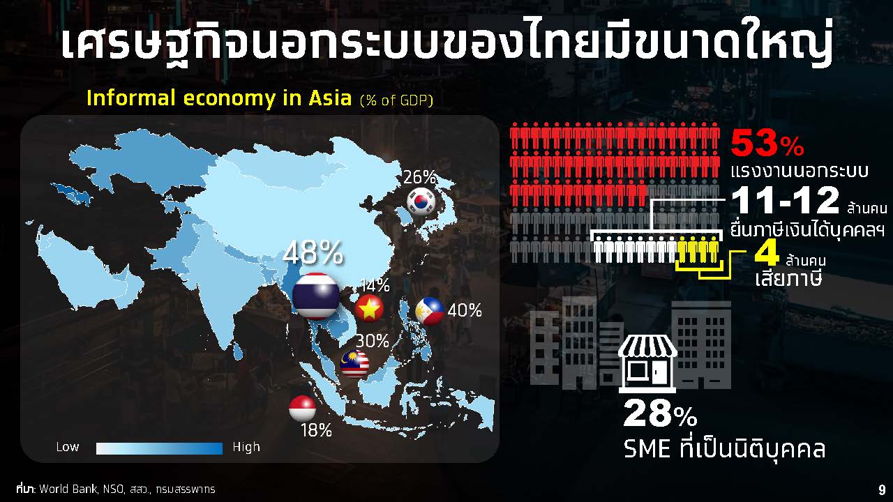 ไม่ใช่แค่หนี้ แต่ “เศรษฐกิจนอกระบบ” ทั้งหมดที่ไทยเผชิญอยู่ก็เป็นเงื่อนไขสำคัญ ข้อมูลของธนาคารโลกประเมินว่ามูลค่ากิจกรรมเศรษฐกิจนอกระบบไทยสูงถึง 48% ของจีดีพี ครึ่งหนึ่งของแรงงานอยู่นอกระบบภาษี ขณะที่ผู้ประกอบการนิติบุคคลมีเพียงหนึ่งในสี่ของผู้เล่นทั้งหมด