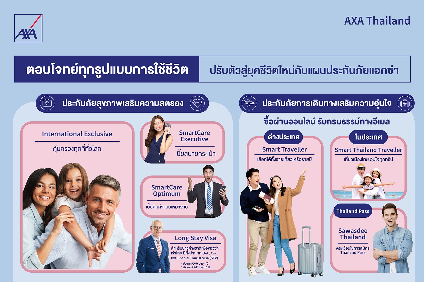 อย่างไรก็ตาม การปรับตัวสู่ยุคชีวิตวิถีใหม่ โดยเฉพาะในด้านการดูแลสุขภาพก็มีความสำคัญ หากมีการเตรียมความพร้อมและการดูแลที่ดีจะช่วยเพิ่มความอุ่นใจ ไร้กังวล และสามารถใช้ชีวิตได้อย่างเต็มที่ วันนี้ แอกซ่าประกันภัย มี “4 แผนประกันภัยสุขภาพ” และ “3 แผนประกันภัยการเดินทาง” ที่ตอบสนองการใช้ชีวิตทุกรูปแบบมานำเสนอ โดยมีความคุ้มครองที่หลากหลาย มีให้เลือกทุกช่วงอายุและไลฟ์สไตล์ที่แตกต่างกัน