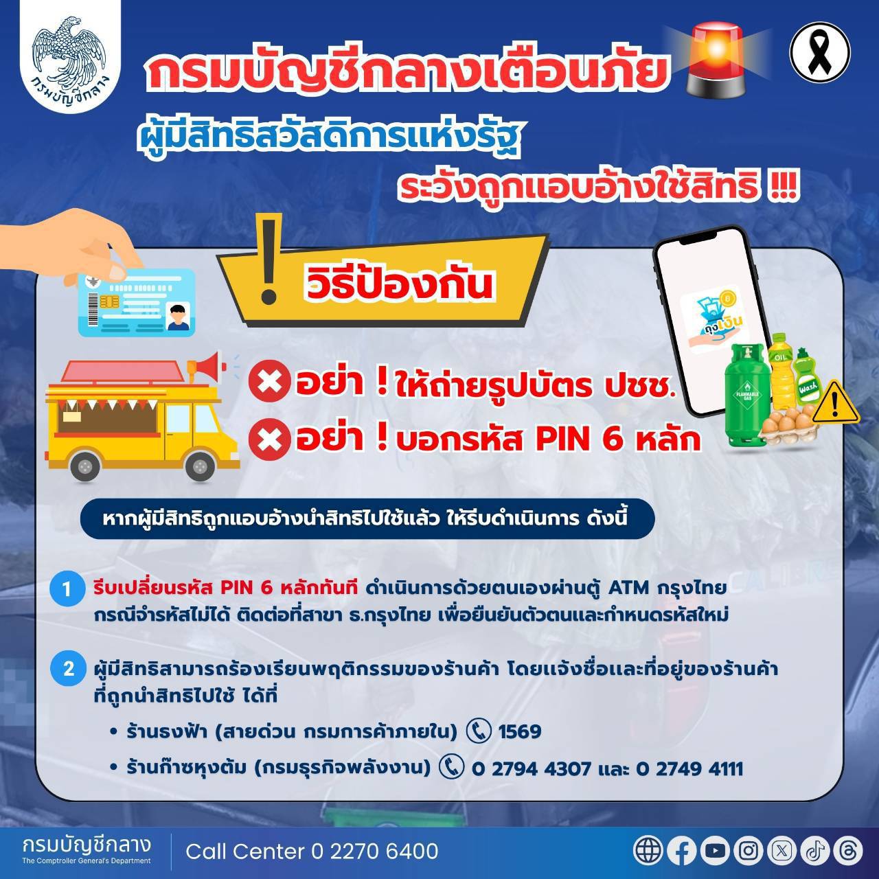 “กรมบัญชีกลางได้ขอความร่วมมือกรมการค้าภายในและกรมธุรกิจพลังงานในการประชาสัมพันธ์ร้านค้าที่เข้าร่วมโครงการฯ ให้ปฏิบัติเงื่อนไขตามประกาศของกรมการค้าภายในและกรมธุรกิจพลังงานโดยเคร่งครัดด้วยแล้ว จึงขอเตือนภัยผู้มีสิทธิสวัสดิการแห่งรัฐ ให้ระมัดระวังการใช้สิทธิสวัสดิการแห่งรัฐกับรถเร่ดังกล่าว เพื่อป้องกันไม่ให้วงเงินซื้อสินค้าในแต่ละเดือนของผู้มีสิทธิสูญหาย ทั้งนี้ หากผู้มีสิทธิถูกแอบอ้างนำสิทธิไปใช้แล้ว ให้รีบเปลี่ยน PIN code 6 หลักทันที โดยสามารถดำเนินการด้วยตนเองผ่านตู้ ATM ธนาคารกรุงไทย กรณีที่จำ PIN code 6 หลักไม่ได้ ให้ติดต่อที่สาขาของธนาคารกรุงไทย เพื่อทำการยืนยันตัวตนใหม่ พร้อมกำหนดรหัสใหม่ ทั้งนี้ ผู้มีสิทธิสามารถร้องเรียนพฤติกรรมของร้านธงฟ้าที่แอบอ้างนำสิทธิสวัสดิการแห่งรัฐไปใช้โดยที่ตนเองไม่ได้เป็นผู้ใช้สิทธิได้ที่สายด่วน กรมการค้าภายใน หมายเลขโทรศัพท์ 1569 หรือร้องเรียนพฤติกรรมของร้านก๊าซหุงต้มได้ที่กรมธุรกิจพลังงาน หมายเลขโทรศัพท์ ” โฆษกกรมบัญชีกลางกล่าว
