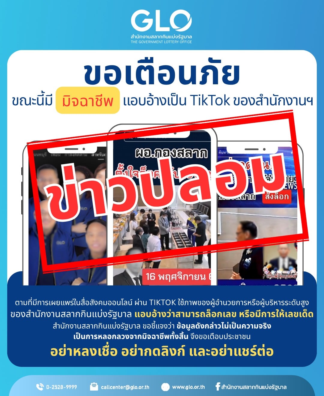สำนักงานสลากกินแบ่งรัฐบาล (GLO) ขอเตือนพี่น้องประชาชน ระวังมิจฉาชีพแอบอ้างชื่อผู้บริหารของสำนักงานฯ หรือดัดแปลงภาพ เสียง ผู้บริหารสำนักงานฯ ด้วย AI และนำไปเผยแพร่บนแพลตฟอร์ม TikTok โดยมีเนื้อหาชวนเชื่อให้เลขล็อก-เลขหลุด ผลการออกรางวัลได้ สำนักงานฯ ขอยืนยันว่า ไม่เป็นความจริง เป็นการหลอกลวงจากมิจฉาชีพ