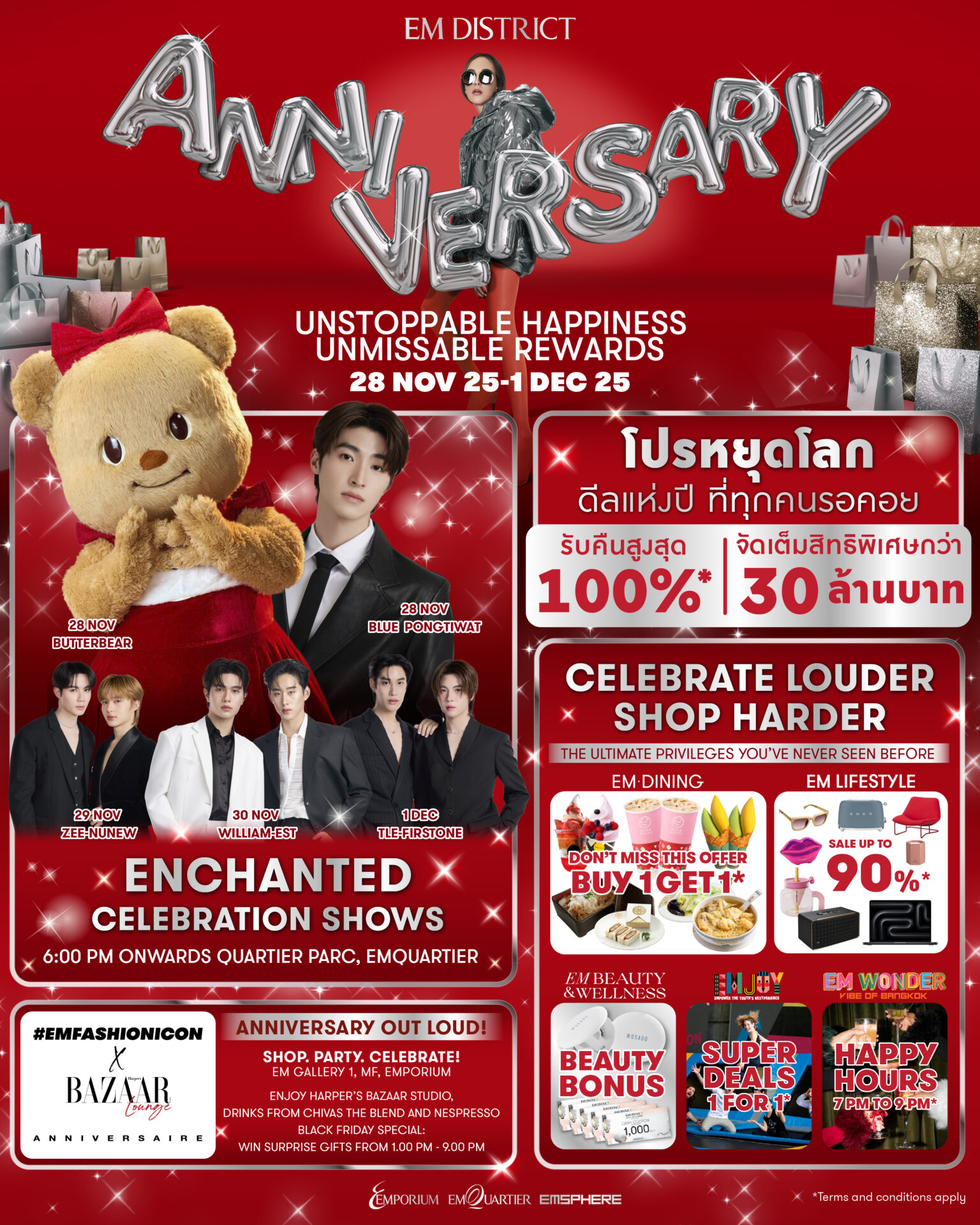 เอ็ม ดิสทริค (เอ็มโพเรียม, เอ็มควอเทียร์, เอ็มสเฟียร์) จับมือกว่า 30 พันธมิตร สร้างปรากฏการณ์ครั้งยิ่งใหญ่จัดงาน EM DISTRICT ANNIVERSARY: UNSTOPPABLE HAPPINESS UNMISSABLE REWARDS และ EM DISTRICT WINTER WONDERLAND ระหว่างวันที่ 27 พฤศจิกายน ถึง วันที่ 5 มกราคม 2569 เฉลิมฉลองครบรอบ 2 ปีแห่งความสำเร็จ ด้วยการทุ่มงบประมาณกว่า 200 ล้านบาท พร้อมด้วยอีเวนต์สุดยิ่งใหญ่ ตระการตา ยาวนานกว่า 1 เดือนเต็ม