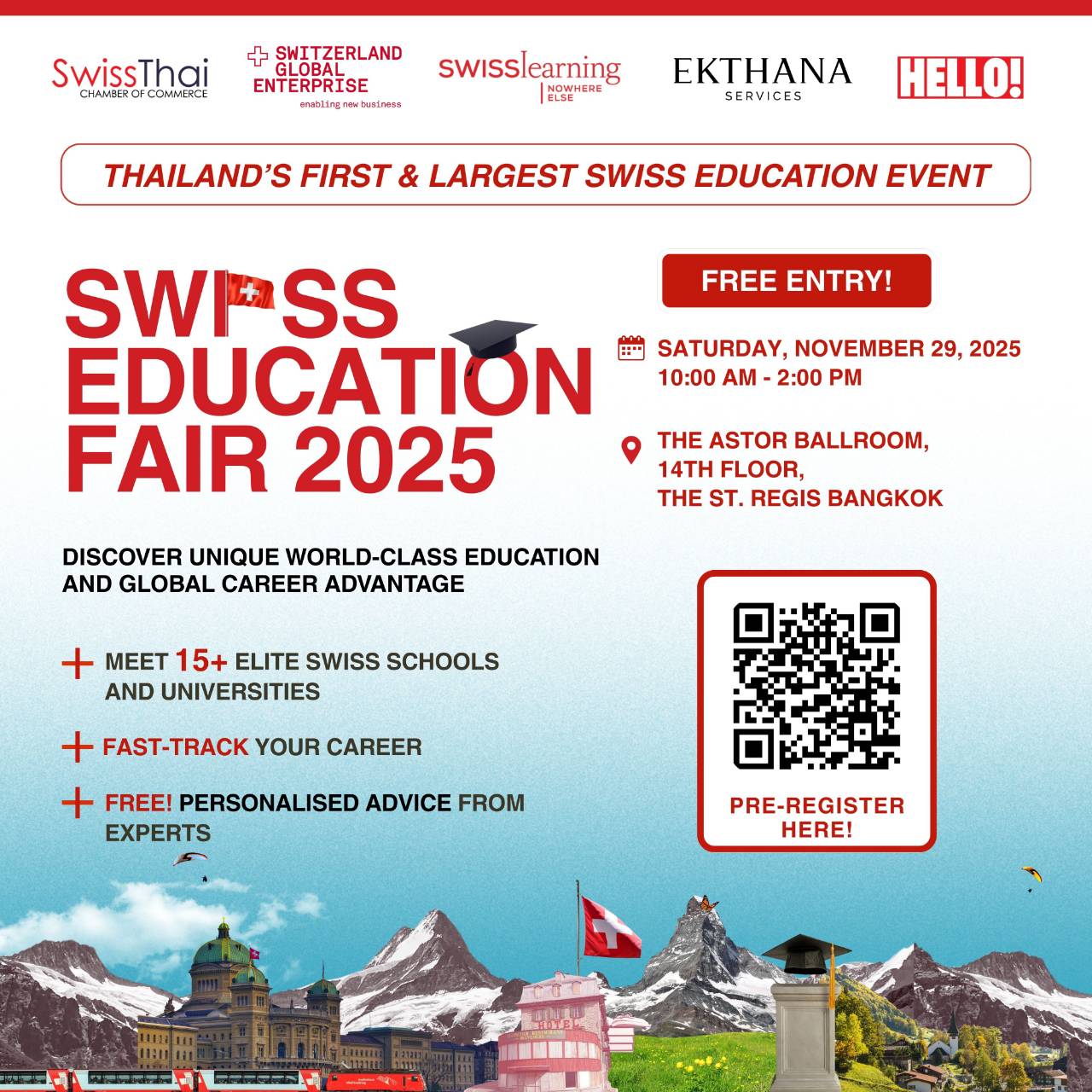 “Swiss Education Fair 2025” งานแนะแนวการศึกษาสวิตเซอร์แลนด์ครั้งยิ่งใหญ่ที่สุดในประเทศไทย ในวันเสาร์ที่ 29 พฤศจิกายน 2568 เวลา 10.00 – 14.00 น. ณ The Astor Ballroom ชั้น 14 โรงแรม เดอะ เซนต์ รีจิส กรุงเทพ งานนี้เข้าร่วมฟรี! ไม่มีค่าใช้จ่าย ติดตามรายละเอียดเพิ่มเติมได้ที่ Facebook: Hello! Thailand