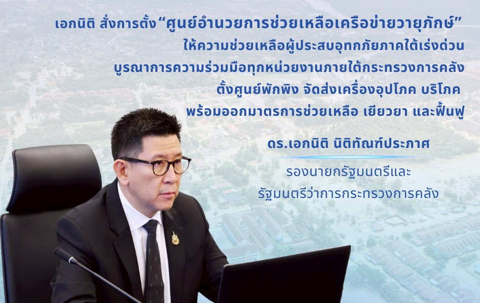 ‘เอกนิติ’สั่งการตั้งศูนย์อำนวยการเครือข่ายวายุภักษ์ช่วยเหลือผู้ประสบอุทกภัยภาคใต้ เร่งด่วนบูรณาการความร่วมมือทุกหน่วยงานในสังกัดกระทรวงการคลัง พร้อมออกมาตรการช่วยเหลือ เยียวยา และฟื้นฟู