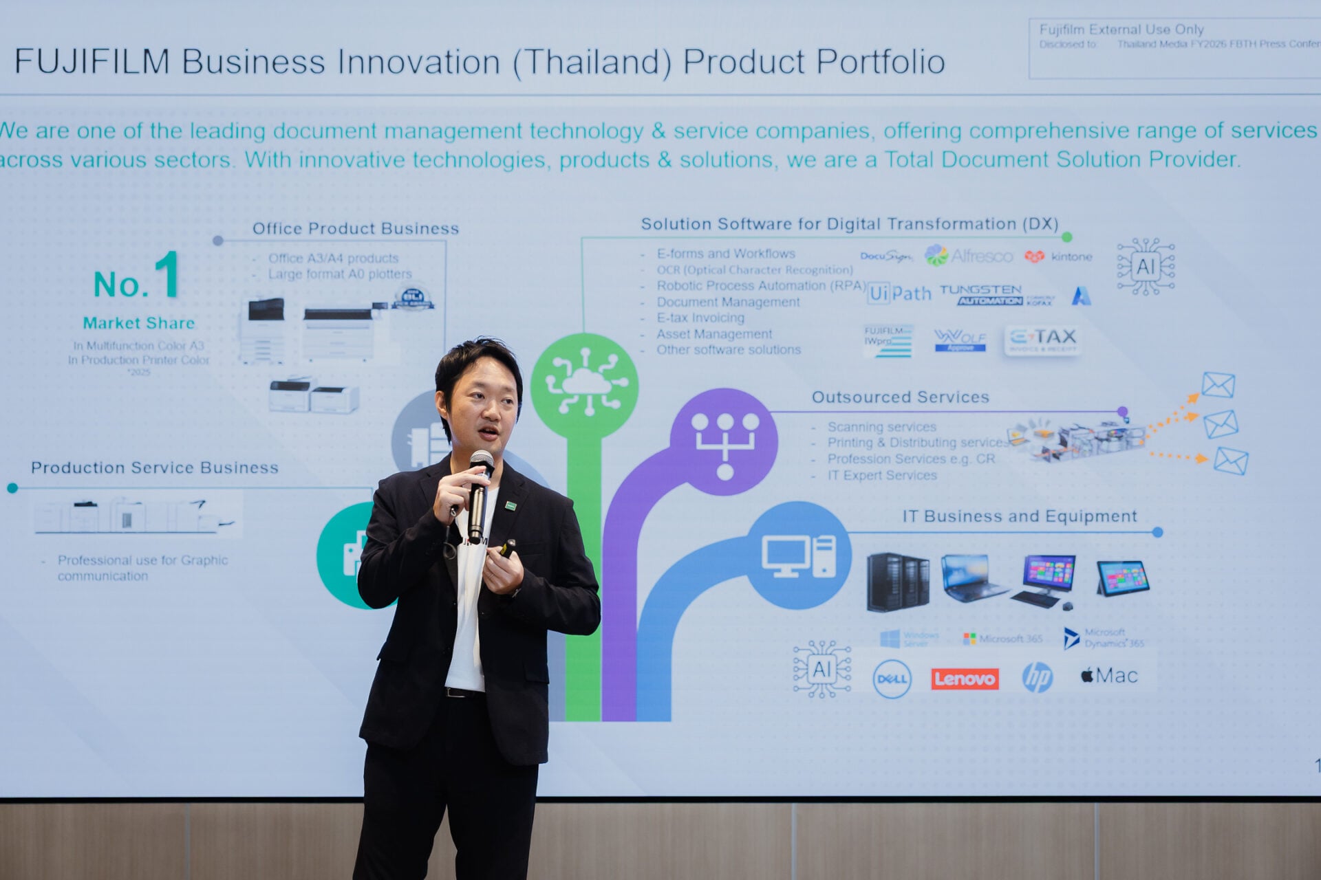 นายฮายาโตะ ซึโบอิ ผู้อำนวยการฝ่ายการตลาดบริษัท ฟูจิฟิล์ม บิสซิเนส อินโนเวชั่น (ประเทศไทย) จำกัด กล่าวว่า แม้ GDP ไทยปี 2569 จะคาดการณ์เติบโตเพียง 1.8% แต่ตลาดที่เกี่ยวข้องกับเทคโนโลยีกลับโตสวนทาง โดยข้อมูลคาดการณ์ระบุว่ามูลค่าตลาด Digital Transformation ในไทย จะพุ่งแตะ 489.61 พันล้านบาท ภายในปี 2573 (โตเฉลี่ย 9.30% ต่อปี) ขณะที่ตลาด AI ในไทยคาดเติบโตสูงถึง 20-25% ต่อปี และตลาด Cyber Security มีมูลค่าสูงถึง 30.59 พันล้านบาท