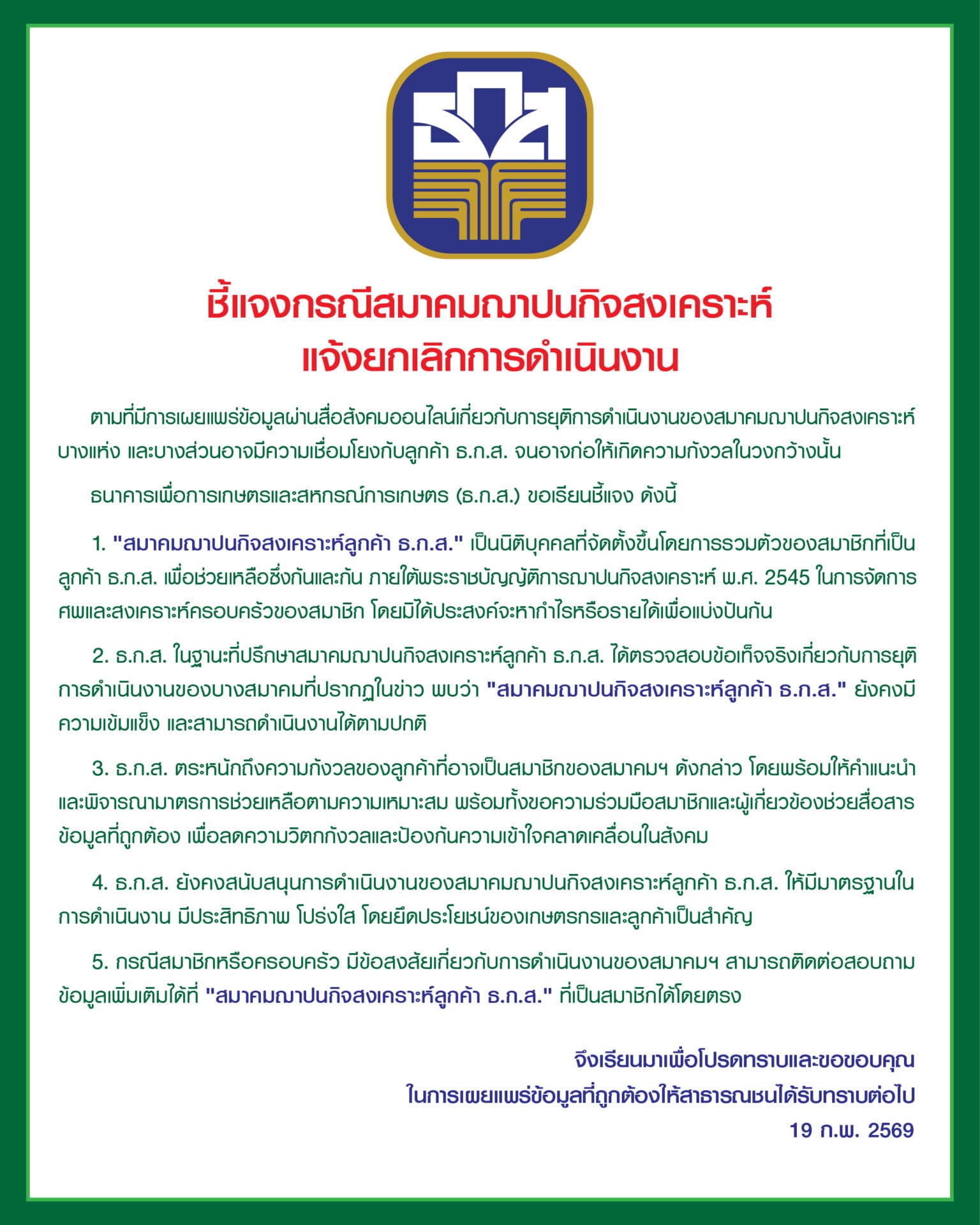 19 ก.พ. 2569 – ผู้สื่อข่าวรายงานว่า ธนาคารเพื่อการเกษตรและสหกรณ์การเกษตร (ธ.ก.ส.) ได้ชี้แจงกรณีการยุติการดำเนินงานสมาคมฌาปนกิจสงเคราะห์บางแห่ง ที่อาจเชื่อมโยงกับลูกค้าของ ธ.ก.ส. จนอาจก่อให้เกิดความกังวลในวงกว้าง ว่า 1. สมาคมฌาปนกิจสงเคราะห์ ลูกค้า ธ.ก.ส. เป็นนิติบุคคลที่จัดตั้งขึ้นโดยการรวมตัวของสมาชิกที่เป็นลูกค้า ธ.ก.ส. เพื่อช่วยเหลือซึ่งกันและกัน ภายใต้พระราชบัญญัติ (พ.ร.บ.) ฌาปนกิจสงเคราะห์ พ.ศ. 2545 ในการจัดการศพและสงเคราะห์ครอบครัวของสมาชิก โดยมิได้ประสงค์จะหากำไรหรือรายได้เพื่อแบ่งปันกัน