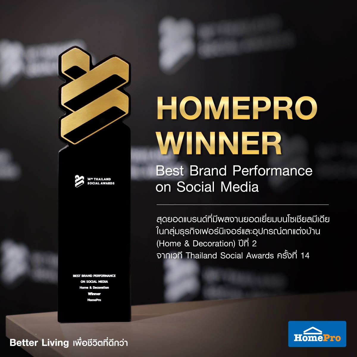 โฮมโปรได้รับรางวัล WINNER กลุ่ม Best Brand Performance on Social Media สาขา Home & Decoration จากเวที Thailand Social Awards ครั้งที่ 14 ซึ่งจัดโดย บริษัท ไวซ์ไซท์ (ประเทศไทย) จำกัด ต่อเนื่องเป็นปีที่ 2 ตอกย้ำความแข็งแกร่งด้านการสื่อสารดิจิทัลและการสร้างการมีส่วนร่วมบนแพลตฟอร์มโซเชียลมีเดียอย่างมีประสิทธิภาพ