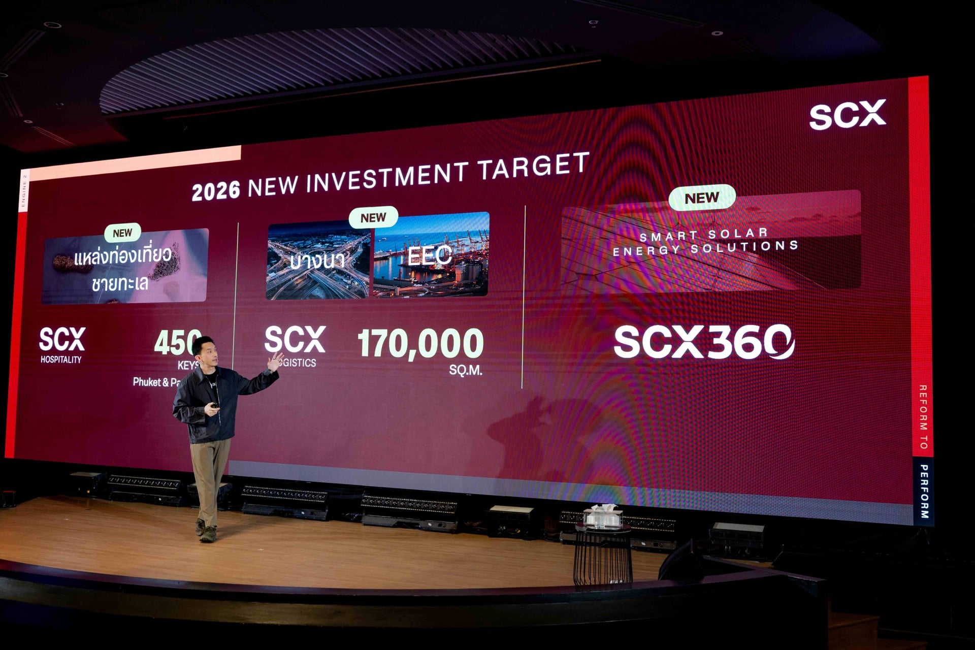 Engine 2 อสังหาฯ รายได้ประจำ ดำเนินงานครอบคลุมทั้งโรงแรม คลังสินค้า อาคารสำนักงาน และอพาร์ตเมนต์ให้เช่าใน U.S. ตั้งเป้ารายได้รวม โตราว 70% ที่ 2,000 ล้านบาท โดยมุ่งขยายธุรกิจ Hospitality เพิ่มอีก 450 ห้อง ในแหล่งท่องเที่ยวชายทะเล เช่น พัทยาและภูเก็ต, พัฒนาคลังสินค้าโซน บางนา-EEC เพิ่มอีก 170,000 ตารางเมตร และ ลงทุนธุรกิจใหม่พลังงานทางเลือก รองรับการเติบโตของ Data Center ภายใต้บริษัท SCX 360