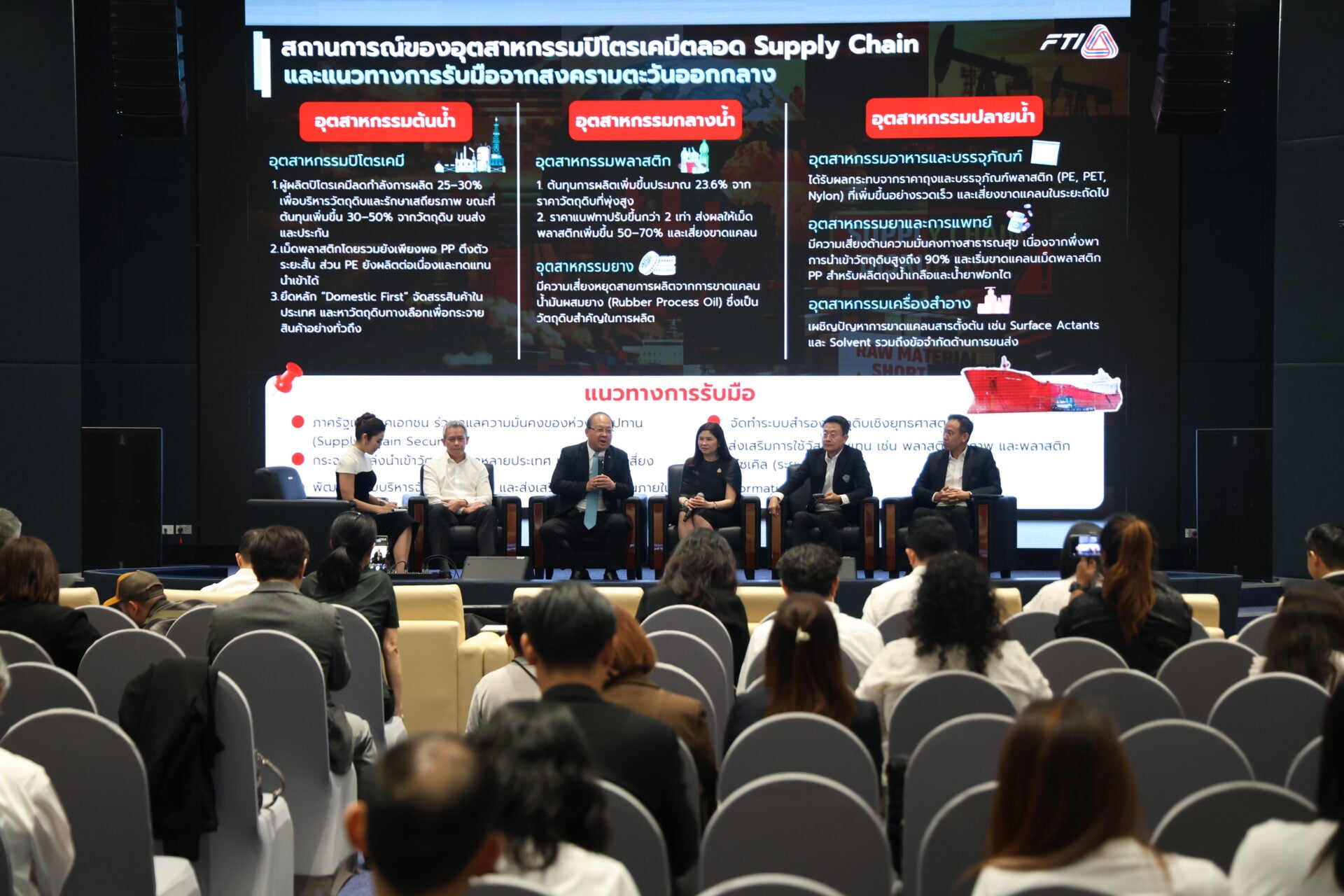 ขณะที่อุตสาหกรรมกลางน้ำ โดยเฉพาะกลุ่มพลาสติก เผชิญกับราคาเม็ดพลาสติกที่ปรับเพิ่ม ขึ้นถึง 50–70% ส่วนอุตสาหกรรมปลายน้ำ เช่น อาหาร บรรจุภัณฑ์ ยา และเครื่องสำอาง ต้องรับแรงกดดันจากต้นทุนที่สูงขึ้น หากสถานการณ์ยืดเยื้อ โดยเฉพาะผู้ประกอบการ SMEs ที่ได้รับผลกระทบอย่างหนักจากต้นทุนที่เพิ่มขึ้นทั้งด้านวัตถุดิบและการขนส่งพร้อมกัน