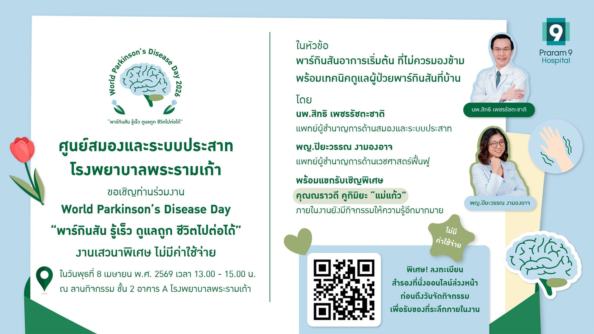 ศูนย์สมองและระบบประสาท โรงพยาบาลพระรามเก้า จัดกิจกรรม World Parkinson’s Disease Day 2026 ‘พาร์กินสัน รู้เร็ว ดูแลถูก ชีวิตไปต่อได้’ ต้อนรับวัน ‘พาร์กินสันโลก’ เพื่อให้ความรู้เกี่ยวกับโรคพาร์กินสัน สัญญาณเตือนในระยะเริ่มต้น และแนวทางการดูแลผู้ป่วยอย่างถูกต้อง