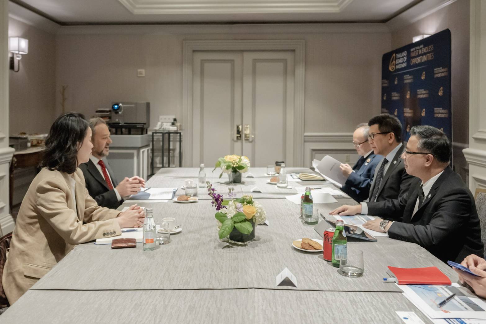 นอกจากนี้ คณะยังได้เข้าหารือกับหอการค้าสหรัฐฯ (U.S. Chamber of Commerce: USCC) โดยแลกเปลี่ยนมุมมองกับผู้บริหารบริษัทชั้นนำ อาทิ Dow Chemical, Chevron, Netflix, PepsiCo, Visa และ IBM ซึ่งต่างมีฐานการดำเนินงานในประเทศไทย การหารือครั้งนี้มีนัยสำคัญเชิงนโยบาย ภาคเอกชนสหรัฐฯ ยืนยันตรงกันว่า ไทยมิใช่เป็นเพียงฐานการผลิตเพื่อส่งออกกลับสหรัฐฯ แต่ทำหน้าที่เป็นศูนย์กลางการดำเนินธุรกิจระดับภูมิภาค สะท้อนความสำคัญเชิงยุทธศาสตร์ของไทยในห่วงโซ่มูลค่าของบริษัทอเมริกันในเอเชีย