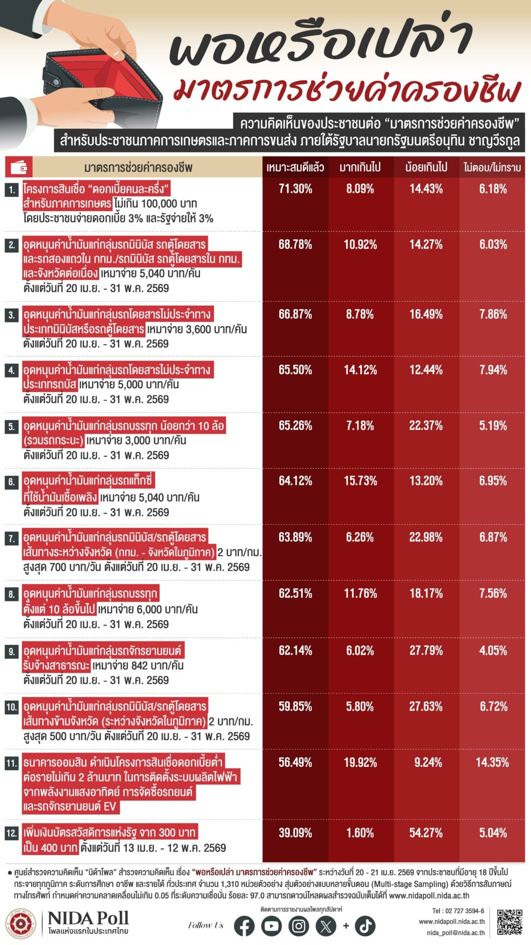 26 เมษายน 2569 – ศูนย์สำรวจความคิดเห็น “นิด้าโพล” สถาบันบัณฑิตพัฒนบริหารศาสตร์ (นิด้า) เปิดเผยผลการสำรวจเรื่อง “พอหรือเปล่า มาตรการช่วยค่าครองชีพ” ทำการสำรวจระหว่างวันที่ 20 – 21 เมษายน 2569 จากประชาชนที่มีอายุ 18 ปีขึ้นไป กระจายทุกภูมิภาค ระดับการศึกษา อาชีพ และรายได้ ทั่วประเทศ รวมจำนวนทั้งสิ้น 1,310 หน่วยตัวอย่าง เกี่ยวกับความคิดเห็นของประชาชนต่อมาตรการช่วยค่าครองชีพของรัฐบาล การสำรวจอาศัยการสุ่มตัวอย่าง