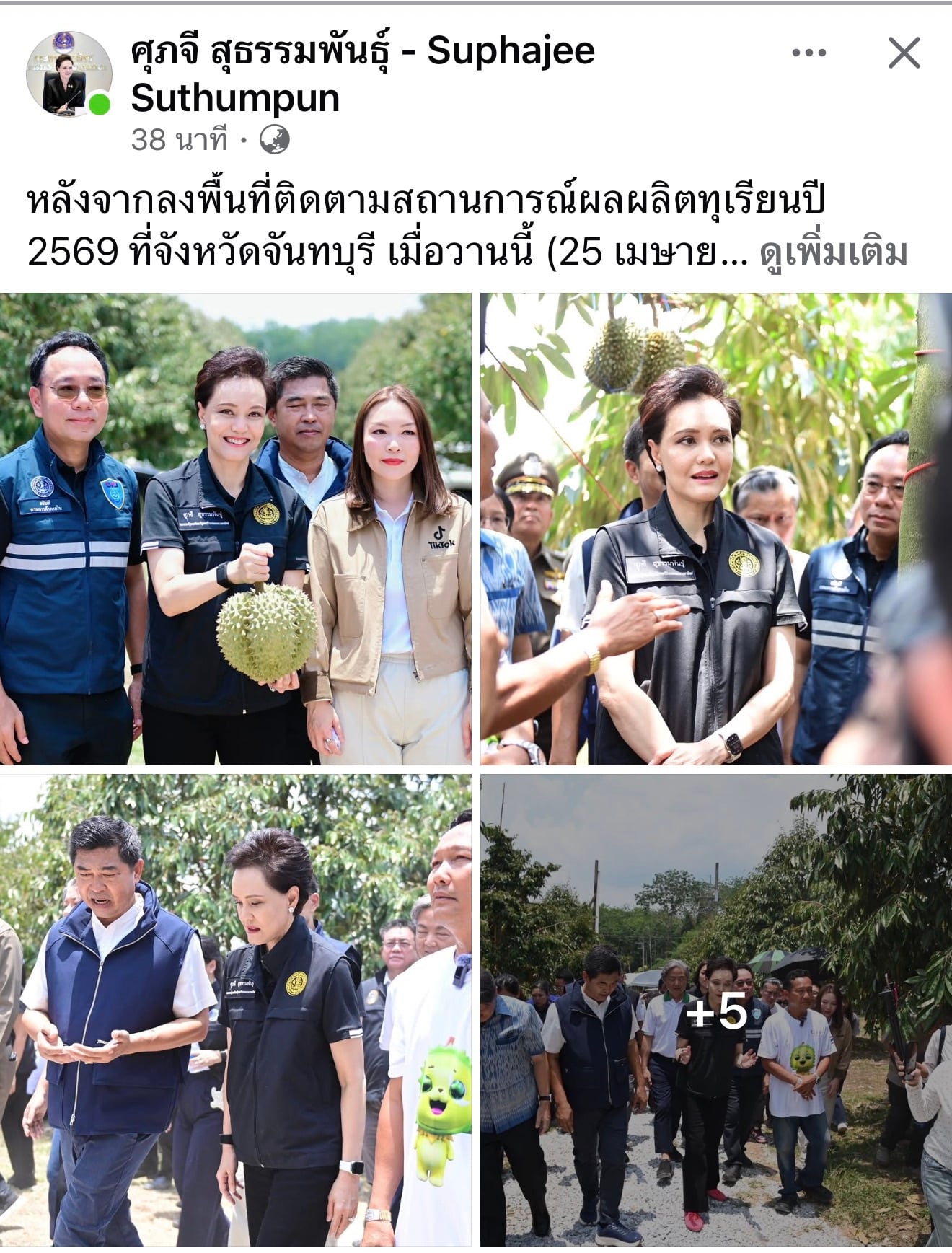 26 เมษายน 2569 นางศุภจี สุธรรมพันธุ์ รองนายกรัฐมนตรีและรัฐมนตรีว่าการกระทรวงพาณิชย์ โพสต์ข้อความระบุว่าหลังจากลงพื้นที่ติดตามสถานการณ์ผลผลิตทุเรียนปี 2569 ที่จังหวัดจันทบุรี เมื่อวานนี้ (25 เมษายน 2569) ได้รับข้อความจากน้องๆ อินฟลูเอนเซอร์หลายท่านที่ส่งมา อยากจะช่วยไลฟ์ขายของในโครงการต่างๆ ของกระทรวงพาณิชย์ คิดว่า น้องๆ คงได้ติดตามจากข่าวการลงพื้นที่ และเห็นข่าวการไลฟ์ขายทุเรียนกับคุณเยี่ยน กงจู่ เยี่ยน เจินเสี่ยน อินฟูลเอนเซอร์จีน ซึ่งต้องขอบคุณมากๆ นะคะ