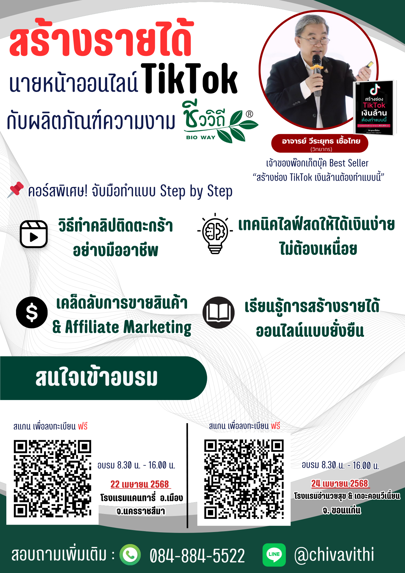 บริษัท เซนต์ บิวตี้ คอสเมติก (ประเทศไทย) จำกัด จัดสัมมนาอบรมเชิงปฏิบัติการ “สร้างรายได้ นายหน้า ออนไลน์ TikTok ผลิตภัณฑ์ความงามชีววิถี” เพื่อเปิดโอกาสให้ประชาชนได้เรียนรู้การสร้างรายได้ผ่าน แพลตฟอร์มออนไลน์ พร้อมขยายช่องทางการตลาดผลิตภัณฑ์สมุนไพรไทยให้เติบโต โดยได้รับเกียรติจาก อาจารย์ วีระยุทธ เชื้อไทย เจ้าของพ็อกเก็ตบุ๊ก Best Seller สร้างช่อง TikTok เงินล้านต้องทำแบบนี้ เป็น วิทยากรถ่ายทอดเทคนิคการสร้างคอนเทนต์และกลยุทธ์การขายออนไลน์ การอบรมจัดขึ้นใน 2 จังหวัด คือ วันที่ 22 เมษายน 2568 โรงแรมแคนทารี่ อำเภอเมือง จังหวัด นครราชสีมา และวันที่ 24 เมษายน 2568 โรงแรมอำนวยสุข แอนด์ เดอะคอนวีเนี่ยน จังหวัดขอนแก่น อบรมเวลา 08.30 – 16.00 น. รับสมัครจำนวนจำกัด 50 ท่านต่อรอบ เพื่อให้การเรียนรู้เป็นไปอย่างมี ประสิทธิภาพสูงสุด และจะปิดรับสมัครทันทีเมื่อครบจำนวน