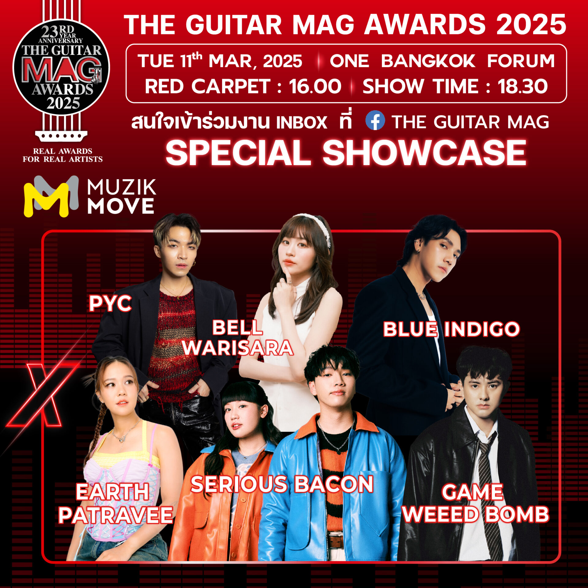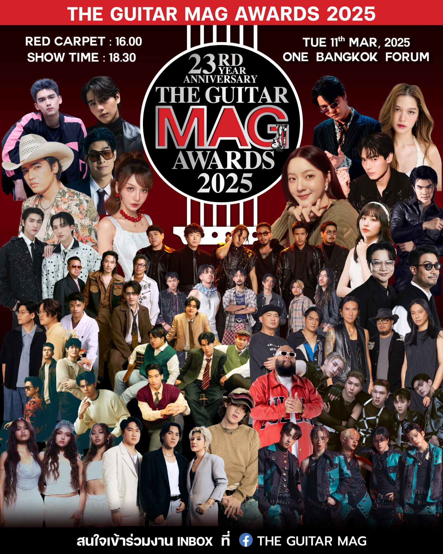 ร่วมเป็นส่วนหนึ่งของงานมอบรางวัลอันทรงเกียรติให้กับคนดนตรีกันได้ สนใจเข้าร่วมงาน Inbox มาได้ที่ FB: The Guitar Mag สมัครสมาชิกนิตยสารหรือซื้อของที่ระลึกเพื่อเข้างาน ติดตามการถ่ายทอดสดได้ที่ Facebook และ Youtube ของ The Guitar Mag ในวันอังคารที่ 11 มีนาคม 2568 ที่ ONE BANGKOK FORUM ลงทะเบียนเข้างานได้ที่ชั้น 2 ตั้งแต่เวลา 11.00 น. / เดินพรมแดงชั้น2 เวลา 16.00-17.45 น. / งานในฮอลล์ (ชั้น3 และ ชั้น4) เริ่มเวลา 18.30 น.