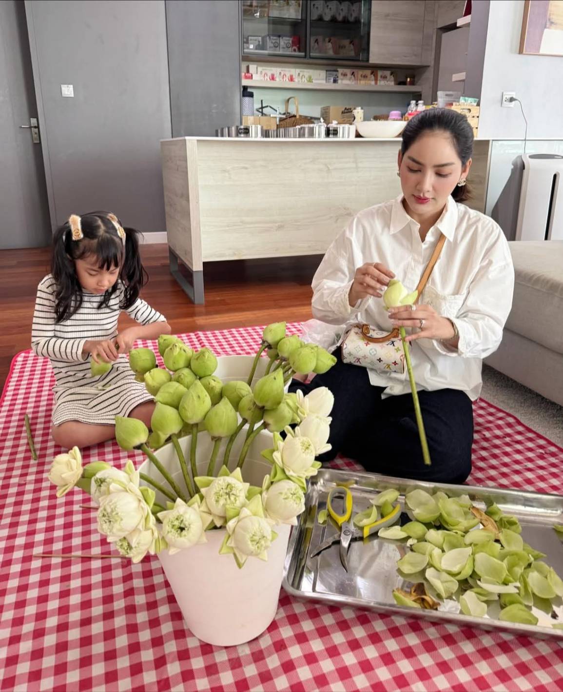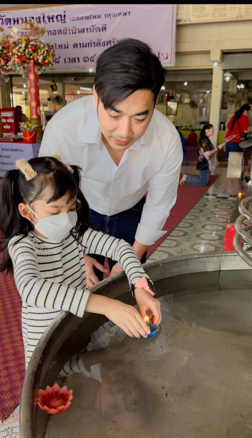 โดยมีภรรยาคู่ใจ "ครูก้อย-นัชชา ลอยชูศักดิ์" และลูกสาวสุดที่รัก "น้องเมดา-อันโดรเมดา ลอยชูศักดิ์" วัยย่าง 6 ขวบ ช่วยกันพับดอกบัว จัดสำรับอาหารใส่ปิ่นโต และเตรียมชุดสังฆทาน เพื่อนำไปถวายพระสงฆ์ที่วัดหนองใหญ่ ซึ่งเป็นวัดใกล้บ้าน นอกจากนี้ ยังได้แจกข้าวเหนียวไก่ทอดให้กับผู้ที่มาทำบุญที่วัดอีกด้วย