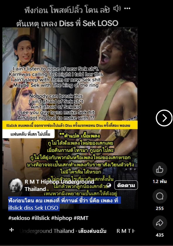 ซึ่งเนื้อเพลงเป็นภาษาอังกฤษ ที่ทางเพจแปลเป็นภาษาไทยได้ว่า "กูไม่ได้ฟังเพลงใหม่ของเสกเลย เมื่อคืนกานต์โทรมากูบอกไปแล้ว กูไม่ได้ยุ่งกับพวกมันหรือเพลงใหม่ของเสก บางทีอาจจะเป็นเสกทำเพลงกับราชาสังเวียนตัวจริง ไม่มีใครล้มได้หรอก กูไม่กลัวอะไรเกี่ยวกับเสกทั้งนั้น ไม่กลัวพวกลูกน้องเสกด้วย เห็นพวกมึงพยายามปั้นเสกให้ดังอยู่ แต่กูไม่มีอะไรจะต้องดีลกับพวกมึงหรอก"