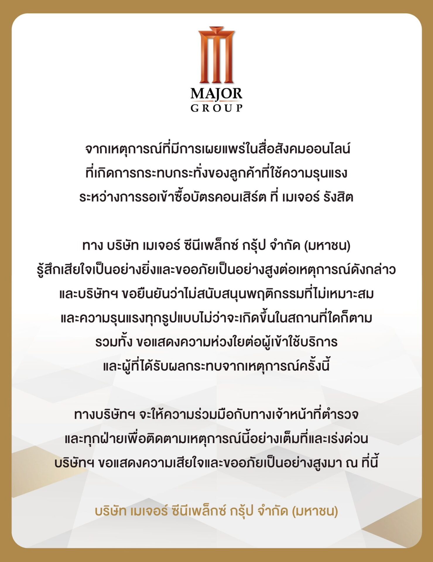 เราขอแสดงความห่วงใยต่อผู้ได้รับผลกระทบจากเหตุการณ์ และขอเป็นกำลังใจให้ผู้ที่ยืนหยัดในความถูกต้อง รวมถึงแฟนคลับตัวจริงที่ตั้งใจจะมาซื้อบัตรอย่างสุจริต บริษัทอยู่ระหว่างการตรวจสอบข้อเท็จจริงอย่างเร่งด่วน รวมถึงให้ความร่วมมือกับเจ้าหน้าที่ตำรวจ เบื้องต้นทางบริษัทได้ดำเนินการปิดจุดจำหน่ายสาขารังสิตเป็นการชั่วคราว โดยจะนำข้อมูลที่ได้รับไปพัฒนาและปรับปรุงระบบการจัดจำหน่ายบัตรให้มีความปลอดภัยและเป็นธรรมยิ่งขึ้น