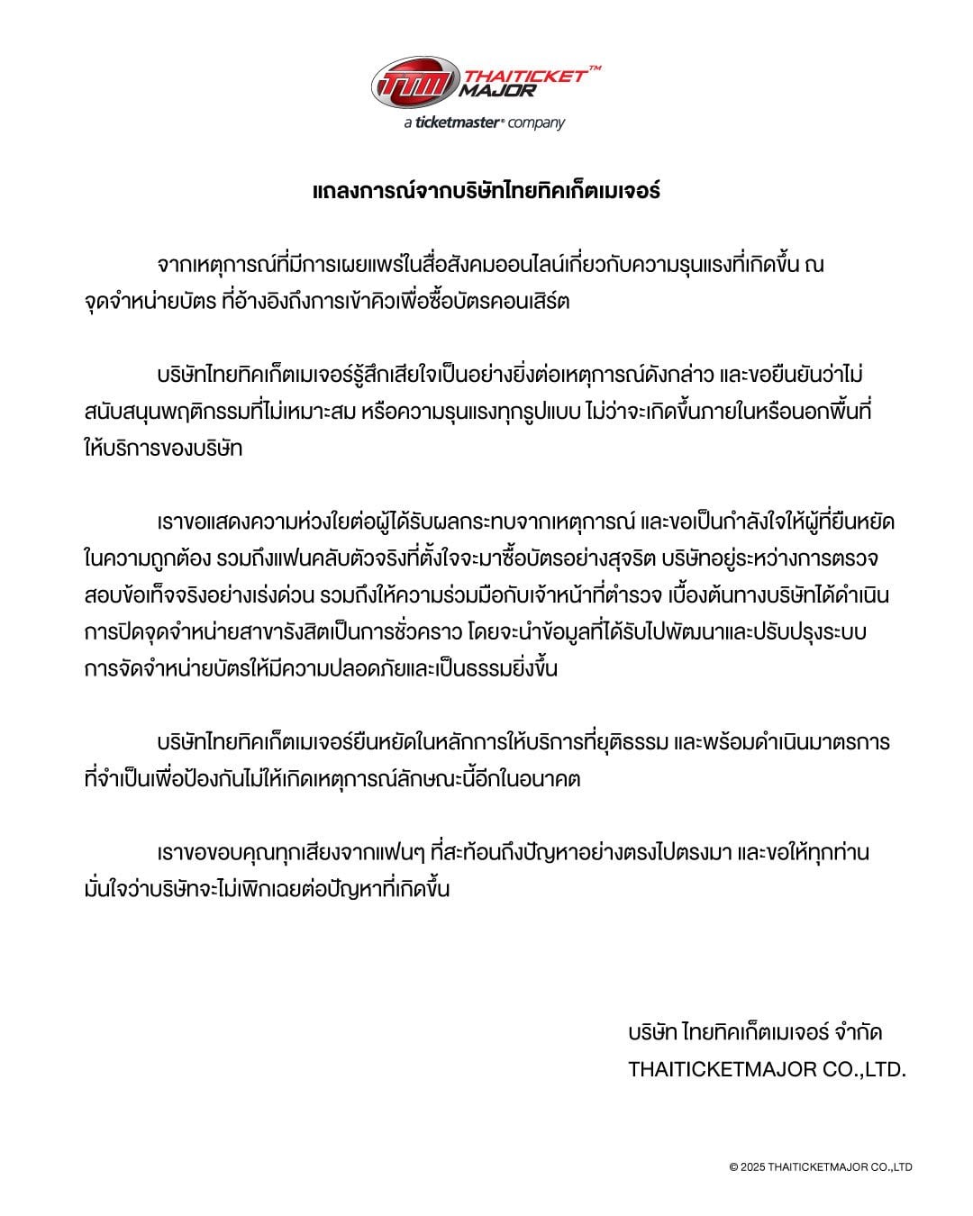 บริษัทไทยทิคเก็ตเมเจอร์ยืนหยัดในหลักการให้บริการที่ยุติธรรม และพร้อมดำเนินมาตรการที่จำเป็นเพื่อป้องกันไม่ให้เกิดเหตุการณ์ลักษณะนี้อีกในอนาคต