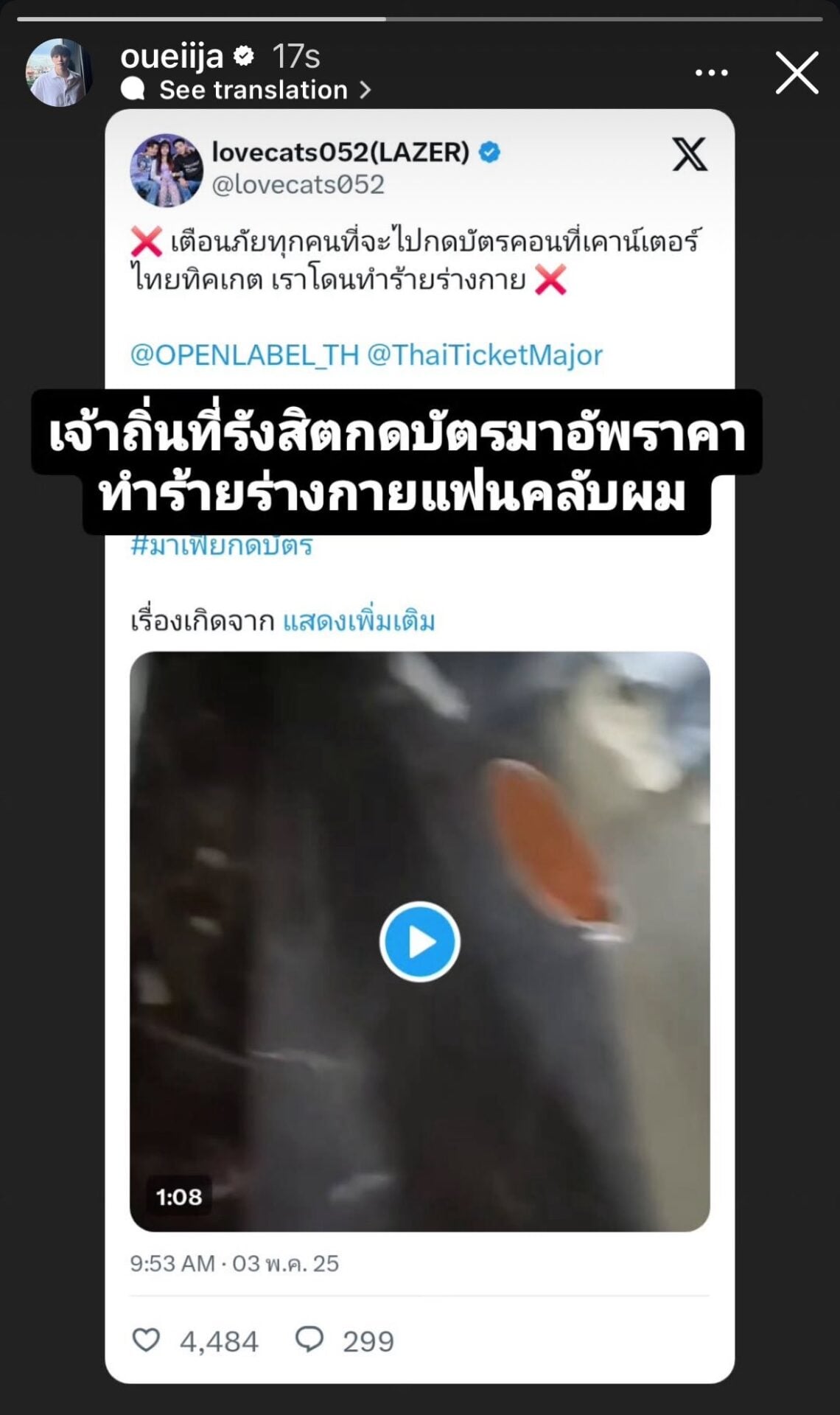 โดยแฟนคลับที่โดนทำร้ายโพสต์คลิปหลักฐานตอนที่โดนคนอ้างว่าเป็นนายทุนด่าด้วยถ้อยคำหยาบคาย พร้อมเล่าเหตุการณ์ว่า