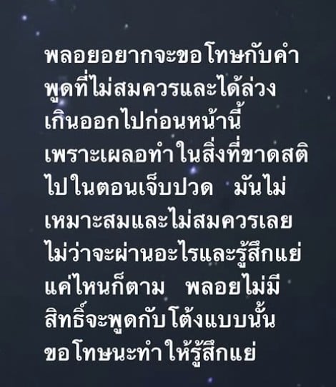 “พลอยอยากจะขอโทษกับคำพูดที่ไม่สมควรและได้ล่วงเกินออกไปก่อนหน้านี้ เพราะเผลอทำในสิ่งที่ขาดสติไปในตอนเจ็บปวด มันไม่เหมาะสมและไม่สมควรเลย ไม่ว่าจะผ่านอะไรและรู้สึกแย่แค่ไหนก็ตาม พลอยไม่มีสิทธิ์จะพูดกับโต้งแบบนั้น ขอโทษนะทำให้รู้สึกแย่