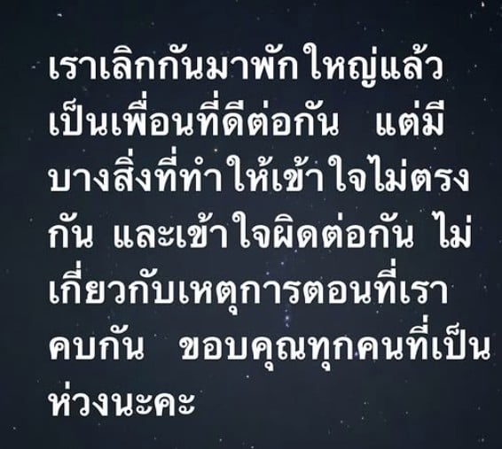 เราเลิกกันมาพักใหญ่แล้ว เป็นเพื่อนที่ดีต่อกัน แต่มีบางสิ่งที่ทำให้เข้าใจไม่ตรงกัน และเข้าใจผิดต่อกัน ไม่เกี่ยวกับเหตุการตอนที่เราคบกัน ขอบคุณทุกคนที่เป็นห่วงนะคะ”