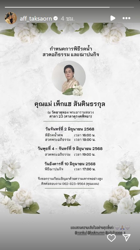 ด้าน แอฟ-ทักษอร ภักดิ์สุขเจริญ ก็ได้ช่วยแชร์กำหนดการดังกล่าวบนอินสตาแกรมสตอรี่ พร้อมแสดงความเสียใจอย่างสุดซึ้ง