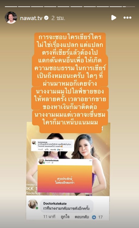 งานนี้บอสณวัฒน์ อิสรไกรศีล เดือด! แคปโพสต์ดังกล่าวของหมอของขวัญ พร้อมแซะกลับผ่านอินสตาแกรมสตอรี่สีส้มที่คุ้นเคยว่า “การจะชอบ ใครเชียร์ใคร ไม่ใช่เรื่องแปลก แต่แปลกตรงที่เชียร์แล้วต้องไปแดกดันคนอื่นเพื่อให้เกิดความชอบธรรมในการเชียร์ เป็นถึงหมอนะครับ ใดๆ ที่ผ่านมาหมอก็เคยจ้างนางงามผมไปไลฟ์ขายของให้หลายครั้ง เวลาอยากขายของหาเงินก็มาติดต่อนางงามผมแต่เวลาจะชื่นชมใครก็มาเหน็บแนมผม”