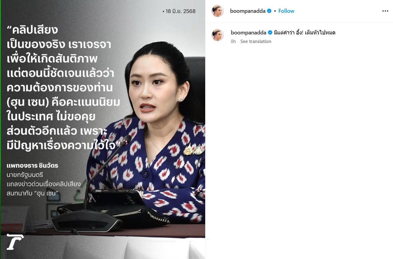 โดย บุ๋ม ปนัดดา ได้แชร์ภาพข่าวของนายกฯ แพรทองธาร ที่ระบุข้อความว่า “คลิปเสียงเป็นของจริง เราเจรจาเพื่อให้เกิดสันติภาพ แต่ตอนนี้ชัดเจนแล้วว่าความต้องการของท่าน (ฮุนเซน) คือคะแนนนิยมในประเทศ ไม่ขอคุยส่วนตัวอีกแล้ว เพราะมีปัญหาเรื่องความไว้ใจ” แพรทองธาร ชินวัตร นายกรัฐมนตรี แถลงข่าวด่วนเรื่องคลิปเสียงสนธนากับ ฮุนเซน