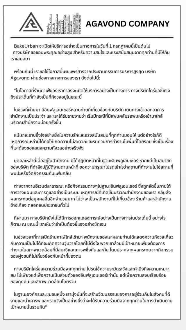 “ในโอกาสที่ร้านคาเฟ่ของเรากำลังจะเปิดให้บริการอย่างเป็นทางการ ทางบริษัทใคร่ขอชี้แจงถึงประเด็นที่กำลังเป็นที่กังวลอยู่ในขณะนี้