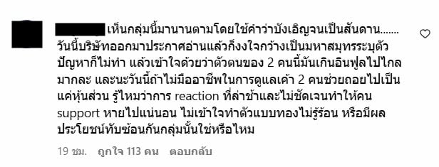 “เห็นกลุ่มนี้มานานตามโดยใช้คำว่าบังเอิญจนเป็นสันดาน....... วันนี้บริษัทออกมาประกาศอ่านแล้วก็งง ใจกว้างเป็นมหาสมุทรระบุตัวปัญหาก็ไม่ทำ แล้วเข้าใจด้วยว่าตัวตนของ 2 คนนี้มันเกินอินฟูลไปไกลมากละ และวันนี้ถ้าไม่มืออาชีพในการดูแลเค้า 2 คนช่วยถอยไปเป็นแค่หุ้นส่วน รู้ไหมว่าการ reaction ที่ล่าช้าและไม่ชัดเจนทำให้คน support หายไปแน่นอน ไม่เข้าใจทำตัวแบบทองไม่รู้ร้อน หรือมีผลประโยชน์ทับซ้อนกันกลุ่มนั้นใช่หรือไหม”