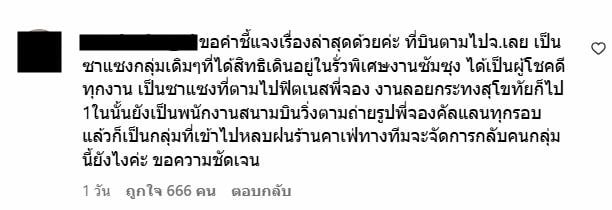 “ขอคำชี้แจงเรื่องล่าสุดด้วยค่ะ ที่บินตามไปจ.เลย เป็นซาแซงกลุ่มเดิมๆที่ได้สิทธิเดินอยู่ในรั่วพิเศษงานซัมซุง ได้เป็นผู้โชคดีทุกงาน เป็นซาแซงที่ตามไปฟิตเนสพี่จอง งานลอยกระทงสุโขทัยก็ไป 1ในนั้นยังเป็นพนักงานสนามบินวิ่งตามถ่ายรูปพี่จองคัลแลนทุกรอบแล้วก็เป็นกลุ่มที่เข้าไปหลบฝนร้านคาเฟ่ทางทีมจะจัดการกลับคนกลุ่มนี้ยังไงคะ ขอความชัดเจน”