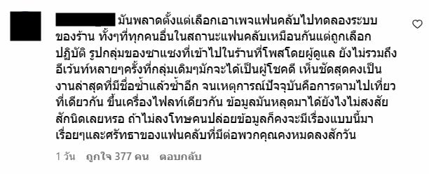 อาทิ “มันพลาดตั้งแต่เลือกเอาเพจแฟนคลับไปทดลองระบบของร้าน ทั้งๆที่ทุกคนอื่นในสถานะแฟนคลับเหมือนกันแต่ถูกเลือกปฏิบัติ รูปกลุ่มของซาแซงที่เข้าไปในร้านที่โพสต์โดยผู้ดูแล ยังไม่รวมถึงอีเวนท์หลายๆครั้งที่กลุ่มเดิมๆมักจะได้เป็นผู้โชคดี เห็นชัดสุดคงเป็นงานล่าสุดที่มีชื่อซ้ำแล้วซ้ำอีก จนเหตุการณ์ปัจจุบันคือการตามไปเที่ยวที่เดียวกัน ขึ้นเครื่องไฟลท์เดียวกัน ข้อมูลมันหลุดมาได้ยังไงไม่สงสัยสักนิดเลยเหรอ ถ้าไม่ลงโทษคนปล่อยข้อมูลก็คงจะมีเรื่องแบบนี้มาเรื่อยๆ และศรัทธาของแฟนคลับที่มีต่อพวกคุณคงหมดลงสักวัน”