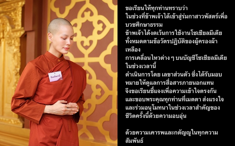 “ขอเรียนให้ทุกท่านทราบว่า ในช่วงที่ข้าพเจ้าได้เข้าสู่ร่มกาสาวพัสตร์เพื่อบวชศึกษาธรรม ข้าพเจ้าได้งดเว้นการใช้งานโซเชียลมีเดีย ทั้งหมดตามข้อวัตรปฏิบัติของผู้ครองผ้าเหลือง การเคลื่อนไหวต่าง ๆ บนบัญชีโซเชียลมีเดียในช่วงเวลานี้ดําเนินการโดย เลขาส่วนตัว ซึ่งได้รับมอบหมายให้ดูแลการสื่อสารภายนอกแทน จึงขอเรียนชี้แจงเพื่อความเข้าใจตรงกัน และขอบพระคุณทุกท่านที่เมตตา ส่งแรงใจและร่วมอนุโมทนาในช่วงเวลาสําคัญของชีวิตครั้งนี้ด้วยความอบอุ่น ด้วยความเคารพและกตัญญูในทุกความสัมพันธ์”