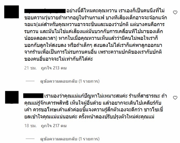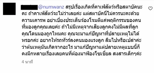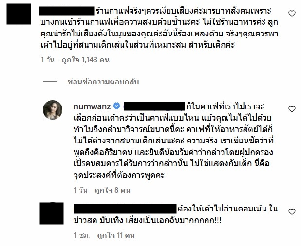น้ำหวานอยู่ในจุดที่ปกป้องลูกด้วยความอดทนสูงสุดคือเดินเข้าไปที่โต๊ะดังกล่าวและมองเพื่อส่งสายตาบอกว่าว่าที่ชั้นสิ และในขณะเดียวกันได้บอกลูกว่าไม่ต้องกลัวนะลูกแม่อยู่ตรงนี้หนูไม่ได้ทำอะไรผิด เพื่อให้กำลังใจลูกไม่ให้กลัวกับสิ่งที่เกิดขึ้น เพราะน้องโกะกำลังจะร้องไห้ และน้ำหวานได้พูดตรงโต๊ะนั้นไปว่าการที่ผู้ใหญ่แสดงปฏิกิริยาแบบนี้ต่อเด็ก มันแย่กว่าสิ่งที่เด็กเสียงดังเยอะมากค่ะ ซึ่งน้ำหวานก็รอเค้าที่จะคุยโต้ตอบ แต่ก็ไม่ได้รับคำตอบคำพูดใดๆ แต่วันนี้รู้สึกอัดอั้นจริงๆ ไม่อยากให้คุณแม่ท่านไหนมาเจอในสิ่งที่เจอแบบน้ำหวาน ในเหตุการณ์จริง มันแย่กว่านี้มากค่ะ”