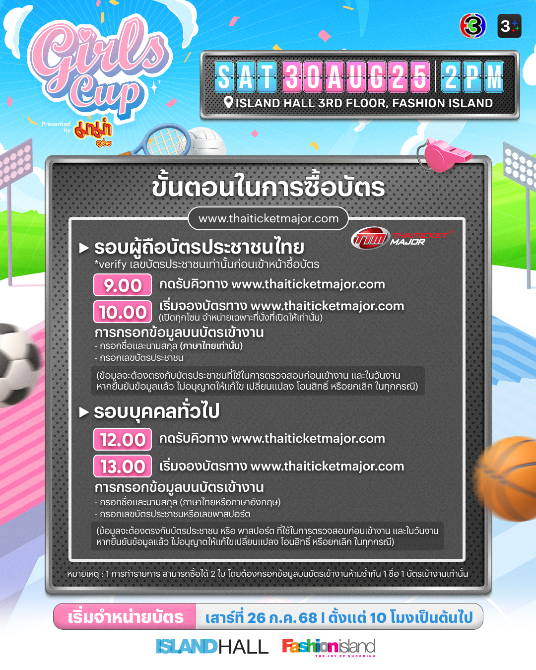 เตรียมเสียงเชียร์ให้พร้อม แล้วรีบจับจองบัตรให้ทัน ในวันเสาร์ที่ 26 กรกฎาคม นี้ทาง www.thaiticketmajor.com โดยจะแบ่งเป็น 2 รอบการจอง 10.00 – 12.00 น. สำหรับผู้ถือบัตรประชาชนไทย และ 13.00 น. เป็นต้นไป รอบทั่วไป ติดตามรายละเอียดเพิ่มเติมและอัปเดตความเคลื่อนไหวได้ทาง Ch3Thailand และ 3Plus
