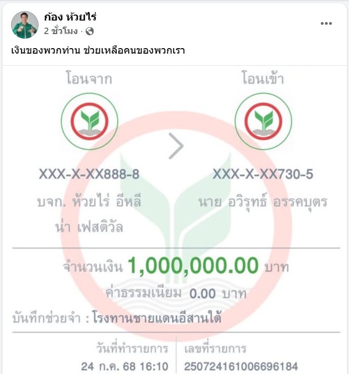 หนุ่มก้อง ห้วยไร ได้โพสต์สลิปของบริษัท ห้วยไร่อีหลีน่าเฟสติวัล โอนให้กับนายอวิรุทธ์ อรรคบุตร ซึ่งผู้บริหารเซิ้ง โปรดักชั่น ผู้สร้างภาพยนตร์ไทบ้านเดอะซีรีส์ จำนวน 1 ล้านบาทถ้วน เพื่อดำเนินการต่อไป นอกจากนี้ยังระบุข้อความว่า “เงินของพวกท่าน ช่วยเหลือคนของพวกเรา”