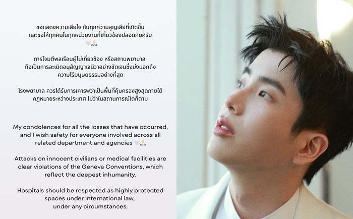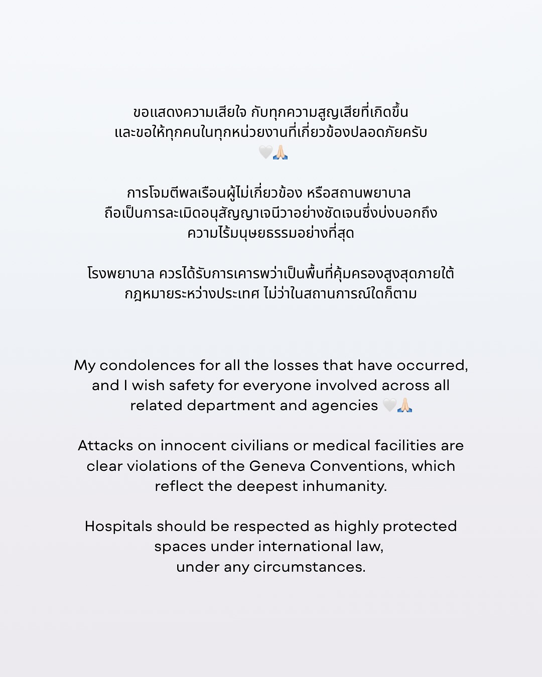 "ขอแสดงความเสียใจกับทุกความสูญเสียที่เกิดขึ้น และขอให้ทุกคนในทุกหน่วยงานที่เกี่ยวข้องปลอดภัยครับ การโจมตีพลเรือนผู้ไม่เกี่ยวข้อง หรือสถานพยาบาล ถือเป็นการละเมิดอนุสัญญาเจนิวาอย่างชัดเจนซึ่งบ่งบอกถึงความไร้มนุษยธรรมอย่างที่สุด โรงพยาบาลควรได้รับการเคารพว่าเป็นพื้นที่คุ้มครองสูงสุดภายใต้ กฎหมายระหว่างประเทศ ไม่ว่าในสถานการณ์ใดก็ตาม