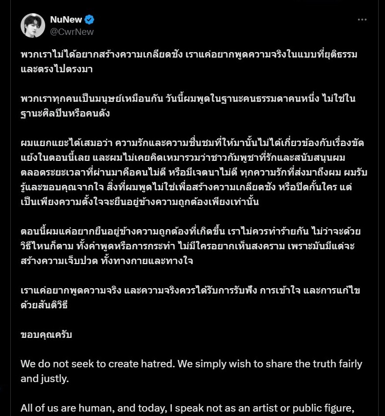 “พวกเราไม่ได้อยากสร้างความเกลียดชัง เราแค่อยากพูดความจริงในแบบที่ยุติธรรมและตรงไปตรงมา พวกเราทุกคนเป็นมนุษย์เหมือนกัน วันนี้ผมพูดในฐานะคนธรรมดาคนหนึ่ง ไม่ใช่ในฐานะศิลปินหรือคนดัง ผมแยกแยะได้เสมอว่า ความรักและความชื่นชมที่ให้มานั้นไม่ได้เกี่ยวข้องกับเรื่องขัดแย้งในตอนนี้เลย และผมไม่เคยคิดเหมารวมว่าชาวกัมพูชาที่รักและสนับสนุนผมตลอดระยะเวลาที่ผ่านมาคือคนไม่ดี หรือมีเจตนาไม่ดี ทุกความรักที่ส่งมาถึงผม ผมรับรู้และขอบคุณจากใจ สิ่งที่ผมพูดไม่ใช่เพื่อสร้างความเกลียดชัง หรือปิดกั้นใคร แต่เป็นเพียงความตั้งใจจะยืนอยู่ข้างความถูกต้องเพียงเท่านั้น