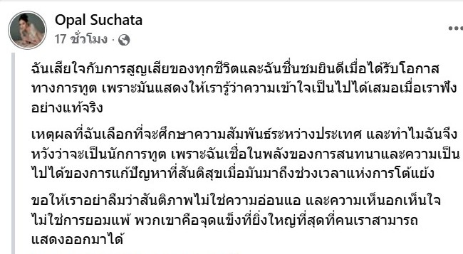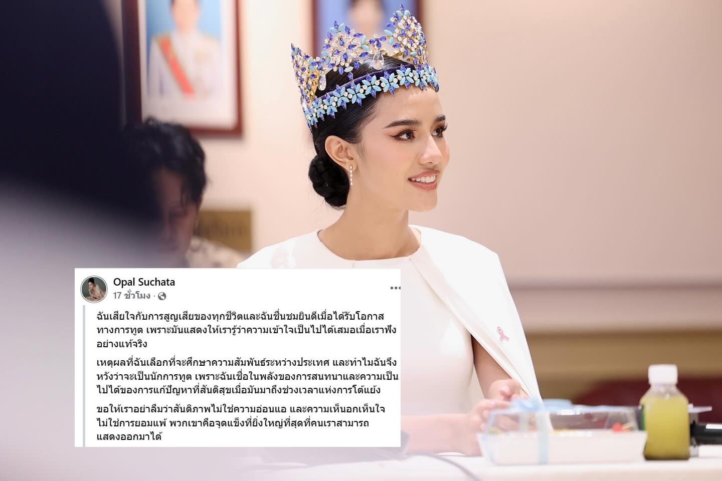 โอปอล-สุชาตา ช่วงศรี นางงามชาวไทย ผู้ดำรงตำแหน่งมิสเวิลด์ 2025 ได้เคลื่อนไหวเกี่ยวกับเหตุการณ์ความไม่สงบบริเวณชายแดนไทย-กัมพูชา ผ่านเฟซบุ๊กส่วนตัว รวมถึงได้แสดงความเสียใจต่อความสูญเสียที่เกิดขึ้น พร้อมย้ำ สันติภาพไม่ใช่สัญลักษณ์ของความอ่อนแอและความเมตตากรุณาไม่ใช่การยอมแพ้