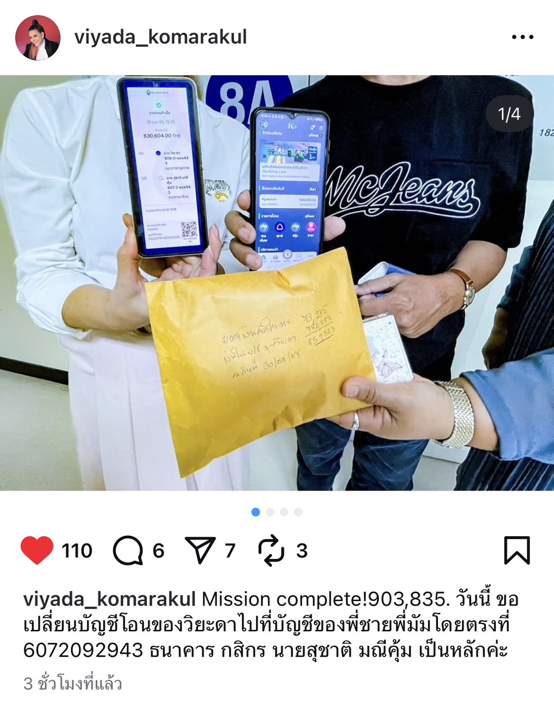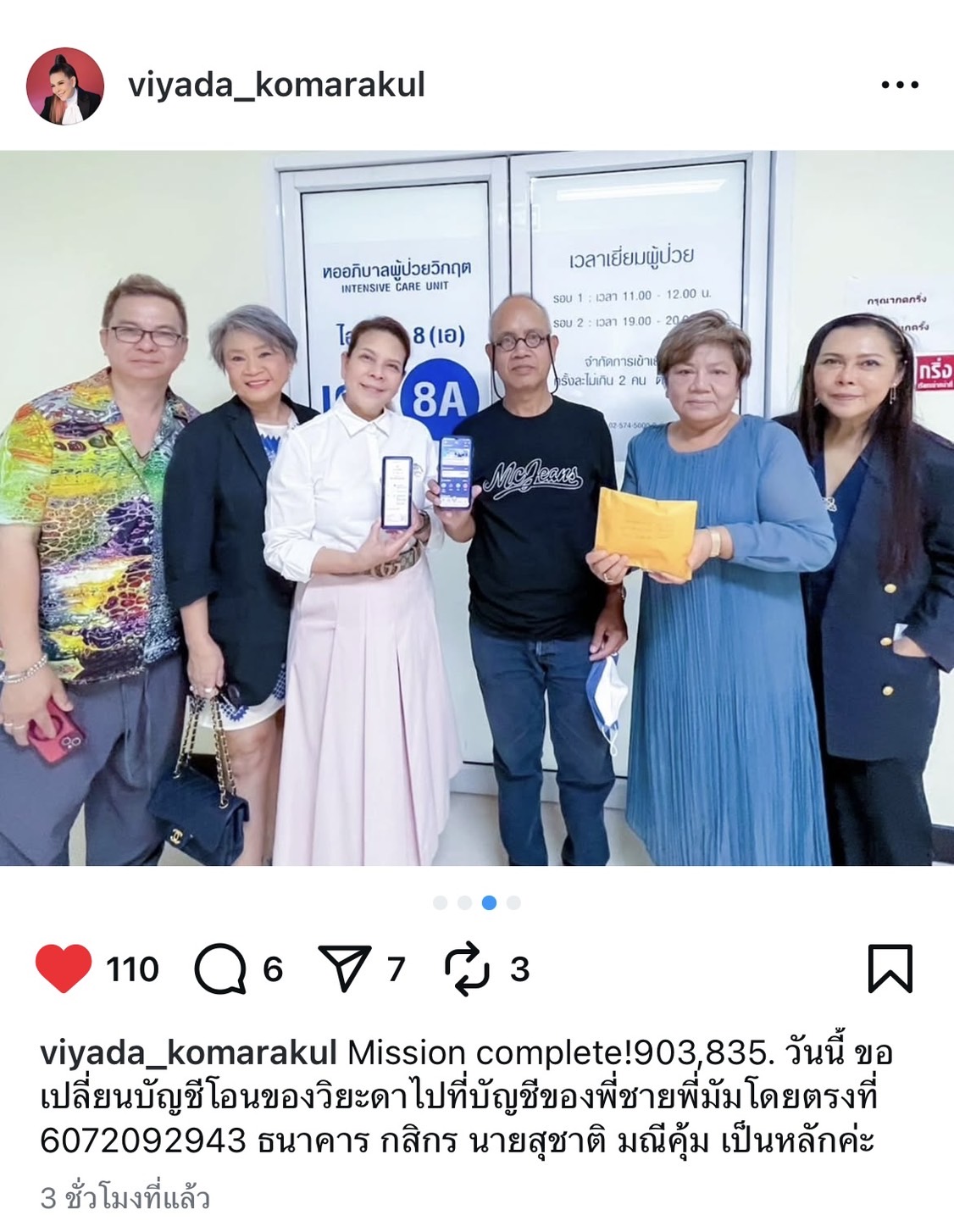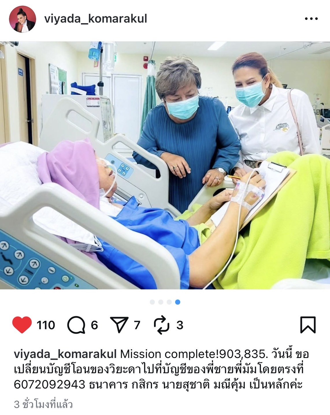 นอกจากนี้ เพื่อความสะดวกในการช่วยเหลือ ทีมผู้จัดคอนเสิร์ตและตุ๊ก วิยะดา ได้แจ้งเปลี่ยนช่องทางการโอนเงินบริจาค โดยให้โอนเงินเข้าบัญชีของ นายสุชาติ มณีคุ้ม พี่ชายของ มัม ลาโคนิคส์ โดยตรง เลขที่บัญชี 607-2-09294-3 ธนาคารกสิกรไทย เพื่อเป็นค่าใช้จ่ายในการรักษาพยาบาลต่อไป