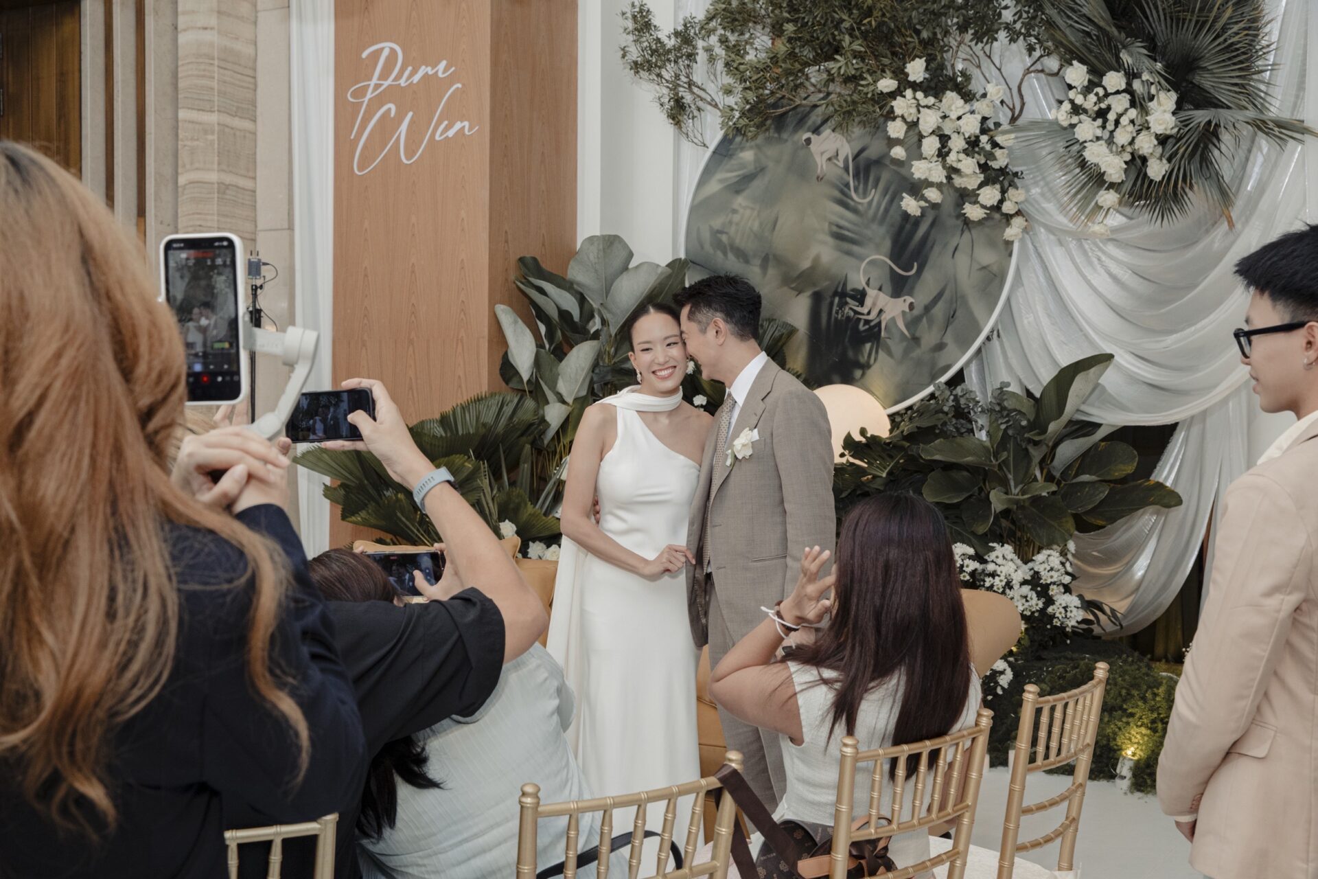 โดยจัดพิธีตามประเพณีในช่วงเช้า และบ่ายเลี้ยงฉลองมงคลสมรส งานนี้เหล่าคนบันเทิงทั้งสายเพลง สายงานแสดง และอื่น ๆ ตบเท้าร่วมยินดีกับบ่าวสาวคึกคัก ไม่ว่าจะเป็น นุ่น วรนุช ภิรมย์ภักดี ,โดนัท มนัสนันท์ พันเลิศวงศ์สกุล และ ตาม จำนงค์อาษา , คริส หอวัง , เป้ อารักษ์ อมรศุภศิริ, กบ พิมลรัตน์ พิศลยบุตร , ภูริ ภูริ หิรัญพฤกษ์, อะตอม ชนกันต์ รัตนอุดม , ป๊อด ธนชัย อุชชิน , ฟุ้ง อัครชนช์ ราชปันดิ, เมื่อย SCRUBB หรือ ธวัชพนธ์ วงศ์บุญศิริ , เจนสุดา ปานโต ,เป้ MVL หรือ บดินทร์ เจริญราษฎร์ พร้อม ภรรยา , ตุ้ย ธีรภัทร์ สัจจกุล , ปาล์ม ปรียวิศว์ นิลจุลกะ , บุรินทร์ บุญวิสุทธิ์ ร่วมถึงศิลปินร่วมค่ายอย่าง วง THE GHOST CAT , SHERRY ,PURPLECAT, KACHAIN ,NAP A LEAN ซึ่งทันทีที่พิธีได้เริ่มขึ้นเจ้าบ่าวควงเจ้าสาวเข้ามาในงานท่ามกลางสายตาของทุกคนที่มาร่วมงานต่างพากันจับจ้องตะลึงในความสวยสง่าของคู่บ่าวสาวอย่างอิ่มเอมใจ จากนั้นเข้าสู่ช่วงพิธีบนเวทีจนไปถึงช่วงเวลาพิเศษในฐานะที่เจ้าบ่าวเป็นนักร้องความพิเศษของงานในวันนี้ทุกคนจะได้ยินเพลงที่แต่งขึ้นมาและเล่นให้ฟังในงานวันนี้เป็นครั้งแรกกับเพลง “แสงสว่าง” ที่ขอมอบให้กับเจ้าสาว ที่เธอเป็นเหมือนแสงสว่างที่เข้าในในชีวิตเลยทำให้บรรยากาศภายในงานอบอวนไปด้วยความโรแมนติกของคู่บ่าวสาวจนหลายคนปลื้มปริ่มและพูดเป็นเสียงเดียวกันว่าเป็นงานที่น่ารัก อบอุ่น อย่างสุด ๆ